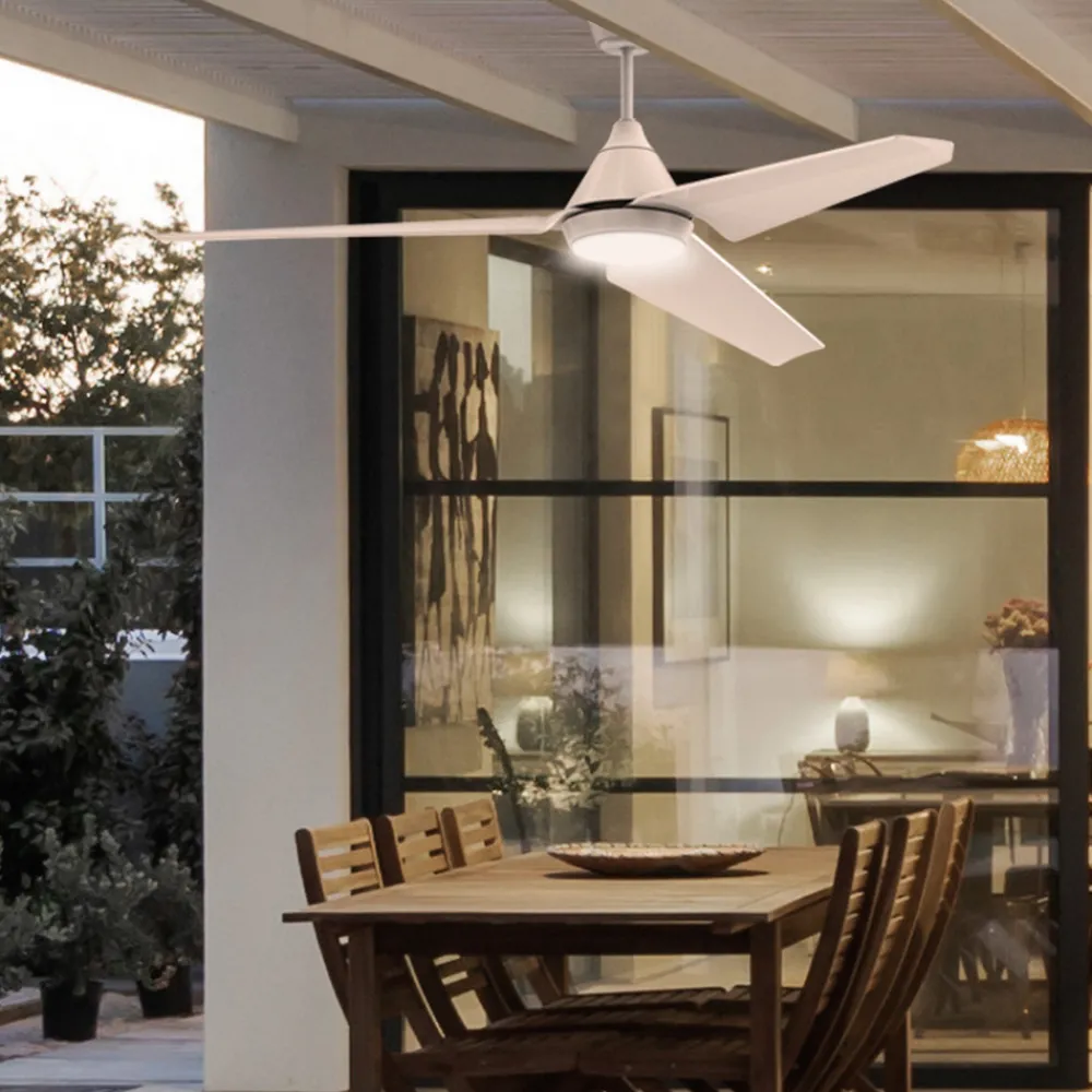 Inkludert fjernkontroll: LED-takvifte Bora for utendørs bruk, dimbar, CCT, IP44Fordi LED-takvifte Bora er beskyttet mot vannsprut, kan den også brukes utendørs – for eksempel under en baldakin i hagen eller over terrassen. Huset er laget av metall, mens de tre bladene er laget av plast. Den presenterer seg helt i hvitt og leveres med fjernkontroll.funksjonerHastigheten kan justeres i seks trinn.i tillegg tilbyr Bora en justerbar sommer- og vinterfunksjon. Om vinteren distribueres den varme luften i rommet via taket, noe som kan bidra til å spare energikostnader.Lysets intensitet er justerbar, det samme er fargetemperaturen.Høyden kan varieres ved hjelp av den vedlagte og valgfrie forlengelsesstangen.Tekniske data- maks. effekt DC-motor: 30 W- maks. luftsirkulasjon: 185 m³ / min.- Timer justerbar: 2 eller 6 timerHastighet og støynivå per trinn:- 68 o / min. (23 dB)- 93 o/min. (30 dB)- 110 o/min. (33 dB)- 124 o/min. (38 dB)- 139 o/min. (42 dB)- 150 o/min. (46 dB)Spesielle funksjoner- med stillegående likestrømsmotor – egnet for soverom- IP44: beskyttet mot sprutvann