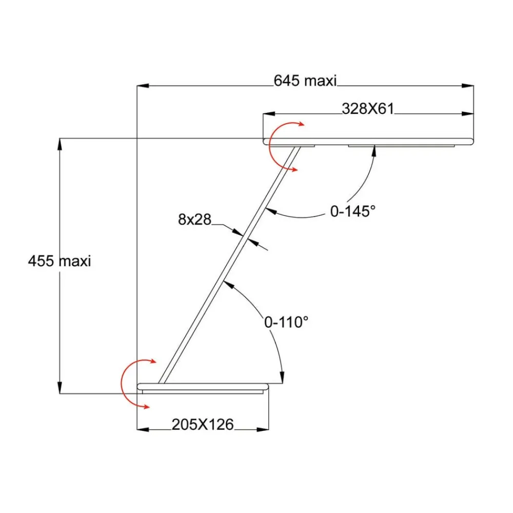 - Fot – lengde 20,5 cm, bredde 12,6 cm; skjerm – lengde 32,8 cm, bredde 6,1 cm; kabellengde 146 cm