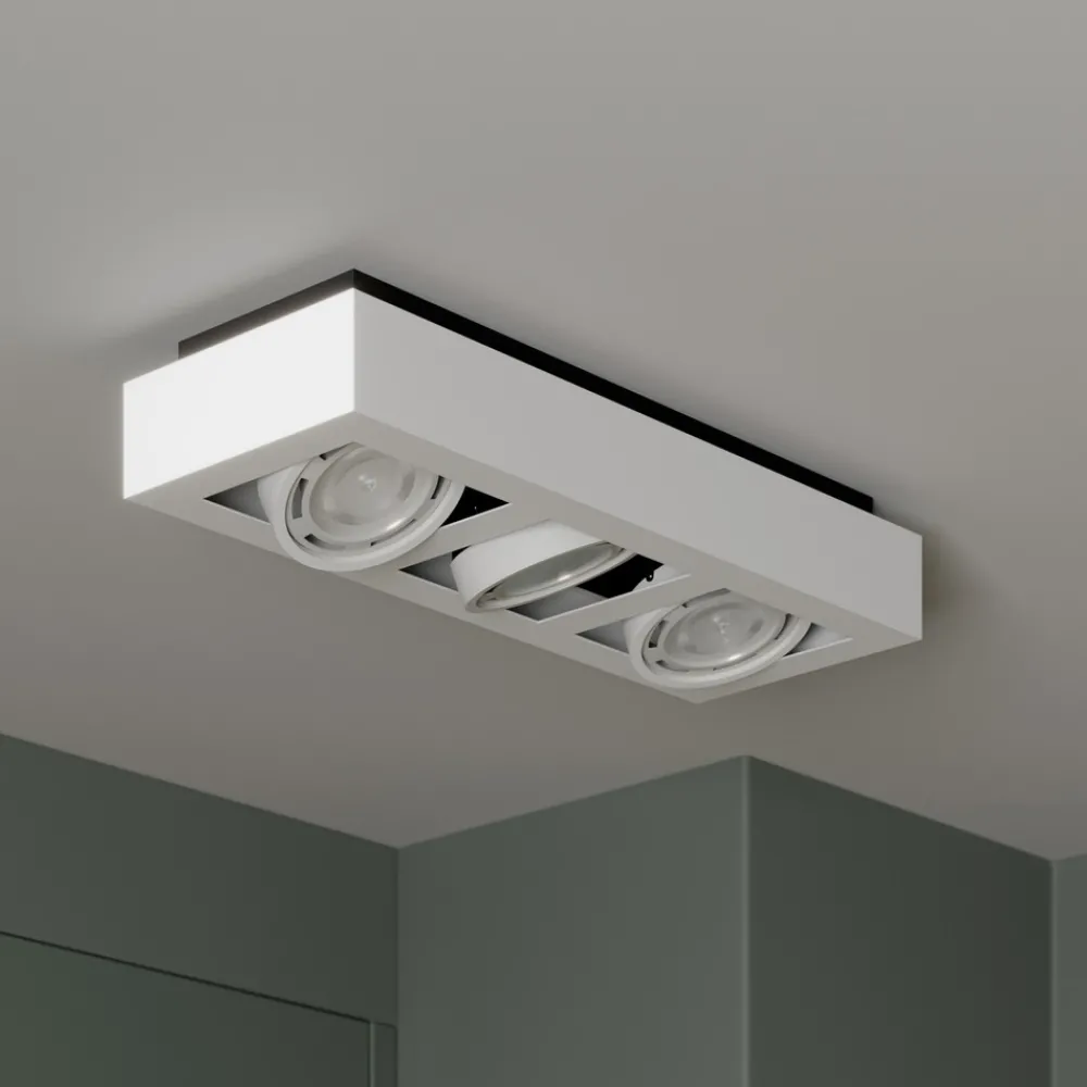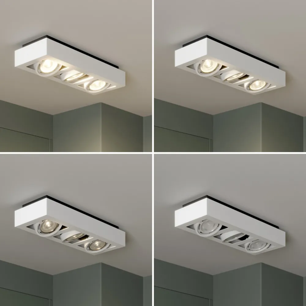 Ronka hvit taklampe for GU10-lamper De tre innsatsene i denne downlighten kan alle svinges og utstyres med kraftige, energibesparende GU10-lamper. I versjonen med 3 lyskilder gir taklampen et svært sterkt lys, noe som gjør denne hvite taklampen ideell til omgivelsesbelysning i rommet. Den egner seg også til bruk i kommersielle miljøer, for eksempel som butikkbelysning. I tillegg er den innebygde tilkoblingsklemmen skruefri, slik at enkelt-, fin- og fåtrådete ledere kan kobles til raskt og trygt uten verktøy. Ronka taklampe har et diskret, funksjonelt utseende som passer fint i bakgrunnen og kan brukes på en rekke ulike måter.