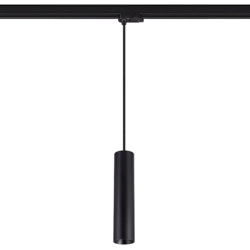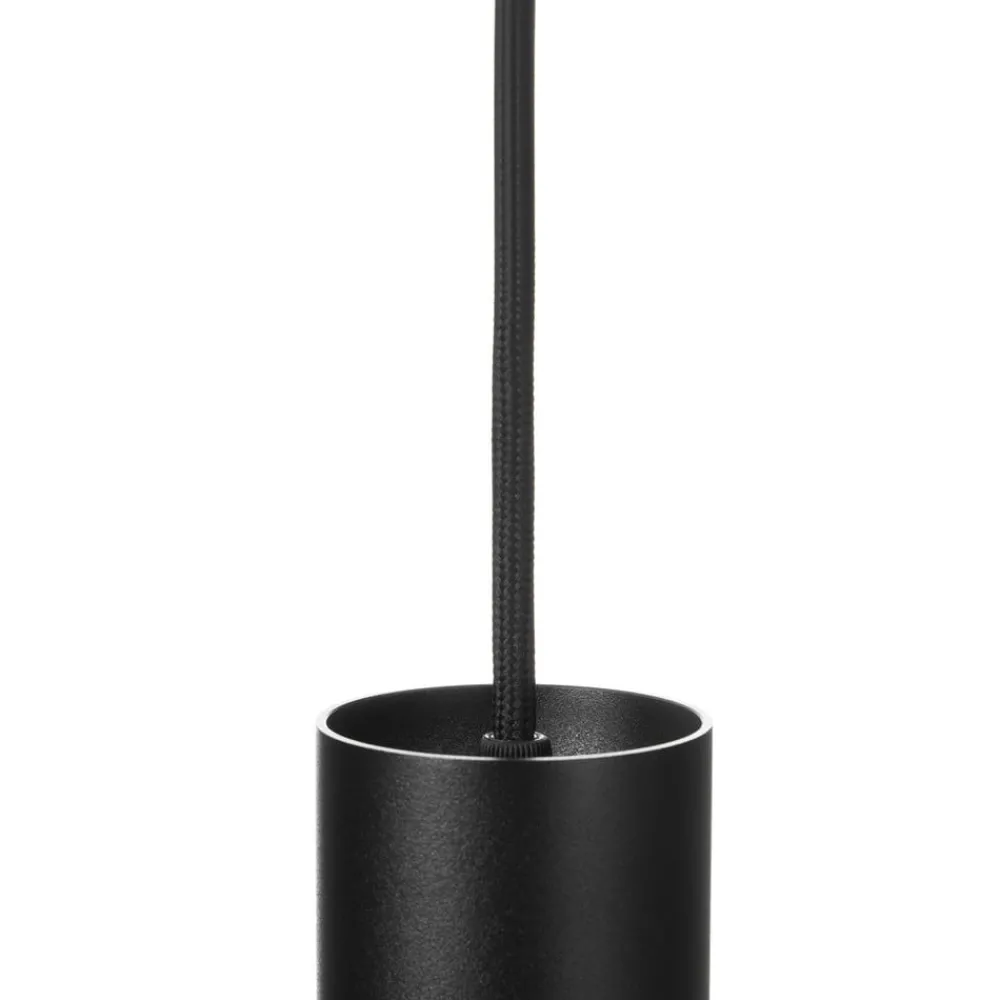 Smal, sylindrisk Ejona pendellampe med adapter for 3-fase skinne Ejona er en svart pendellampe designet for bruk på skinnesystem. Metallskjermens form er smal og rund, og armaturen er holdt i sort, noe som gir den en kjølig eleganse. Fatningen kan utstyres med en GU10-lampe etter eget valg. Du kan velge mellom ulike lysfarger og lysvinkler, slik at du alltid kan være sikker på å finne den rette lampen. Ejona kan brukes på et skinnesystem med tre faser, ikke bare i private rom, men definitivt også i et kommersielt miljø.
