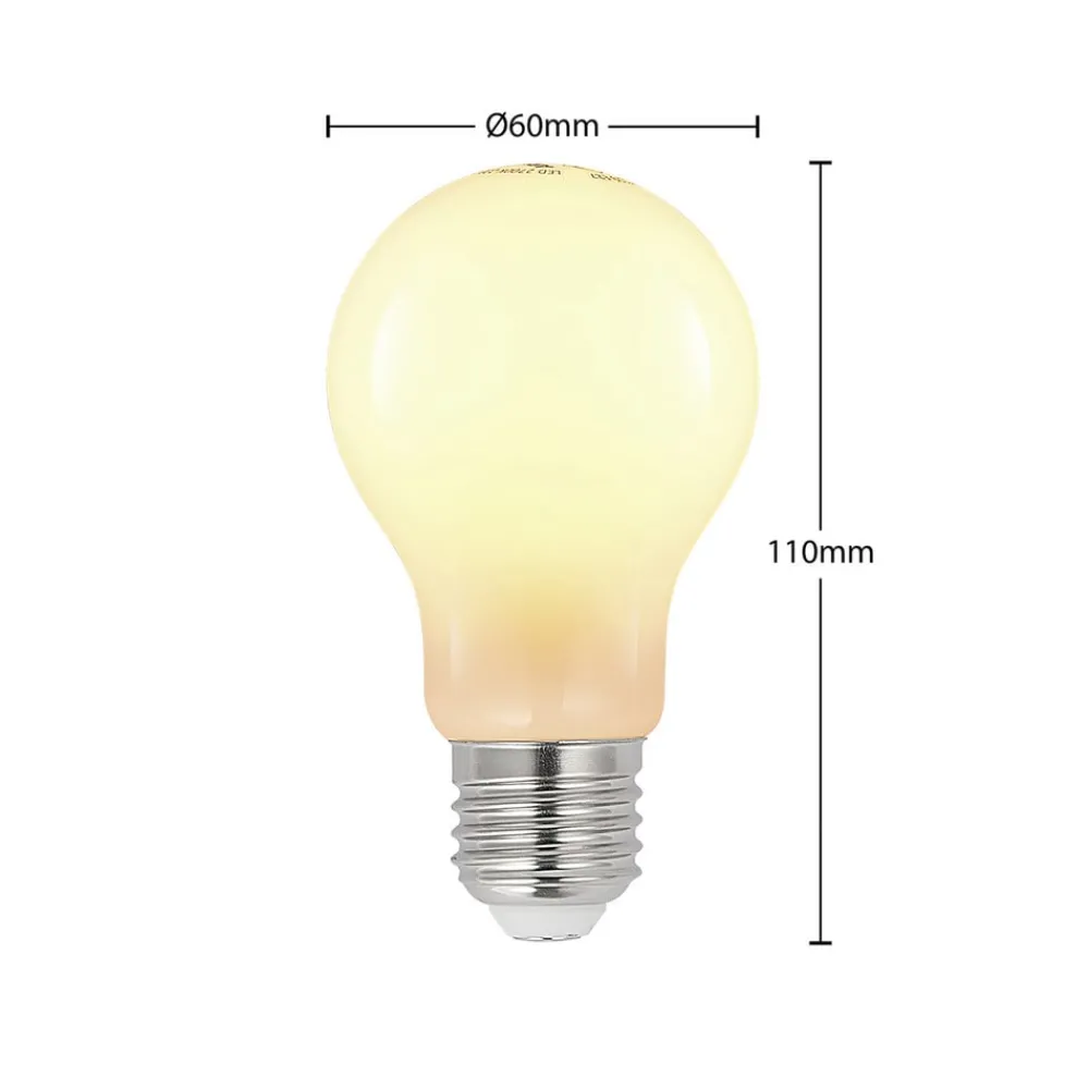 LED-lampe E27 8 W, varmhvit (2700 K), dimbar, med opal overflate i praktisk sett med 2 stk. Denne LED-lampen har opalhvit optikk og er derfor blendingsfri. Lysstyrken tilsvarer lysstyrken til en glødelampe på 70 W, men LED-teknologien er mye mer energibesparende. Lampens lysstyrke kan justeres med en vanlig veggdimmer – dimbar med fasestyring og fasekuttdimmer – leveres i et sett med 2 stk