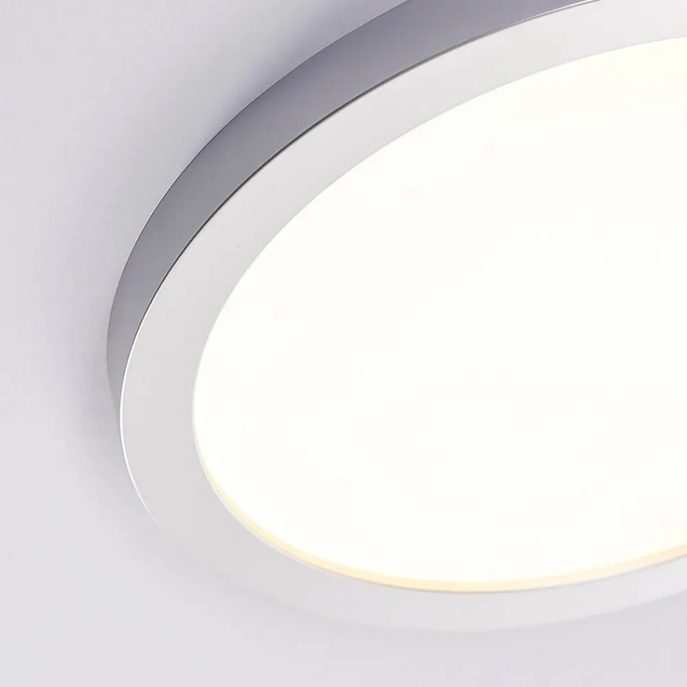 Solvie – LED-taklampe i rund form, 3-trinns dimbar via bryter Denne taklampen er et veldig enkelt eksemplar som kan brukes på en rekke måter. Et hvitt diffusordeksel sørger for jevnt fordelt lys, og den runde LED-taklampen er innrammet av en sølvramme. En spesiell funksjon er den tretrinns dimmemekanismen, som kan betjenes ved hjelp av veggbryteren. Dermed kan lysstyrken tilpasses uten at det er nødvendig å installere ekstra tilbehør eller en dimmer. En allrounder for hele oppholdsrommet!