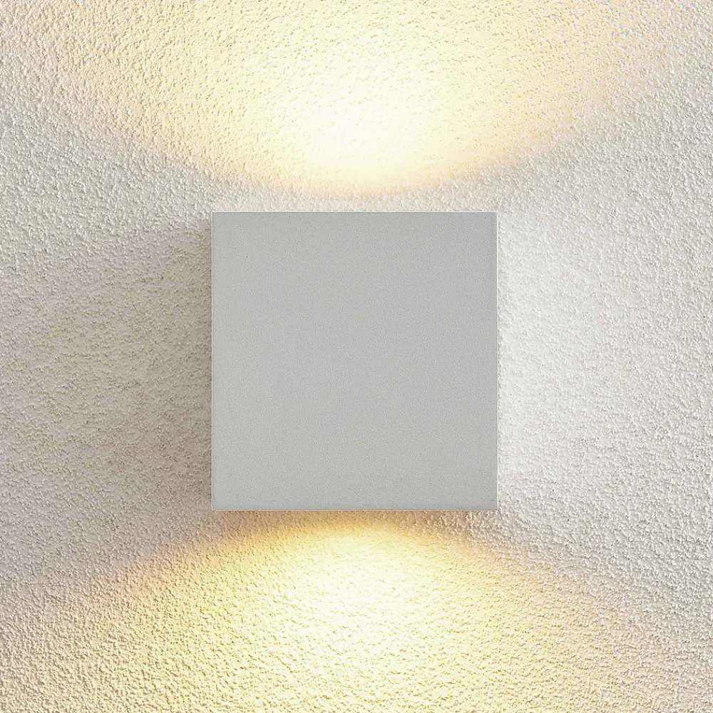 Hvit utendørs vegglampe Tassnim av aluminium i kubeform Utendørs vegglampen Tassnim imponerer med sin moderne og symmetriske design. Den er laget av hvit aluminium, og armaturhusets utside minner om en kube. Med riktig lyskilde får du en pålitelig belysning av uteplassen eller oppkjørselen. IP65-klassifiseringen gjør lampen beviselig støv- og vanntett. Disse egenskapene gjør at Tassnim utendørs vegglampe er perfekt for utendørsarealer og trosser vær og vind. Det enkle utseendet gjør den også perfekt til bruk på yttervegger uten å overskygge resten av arkitekturen.