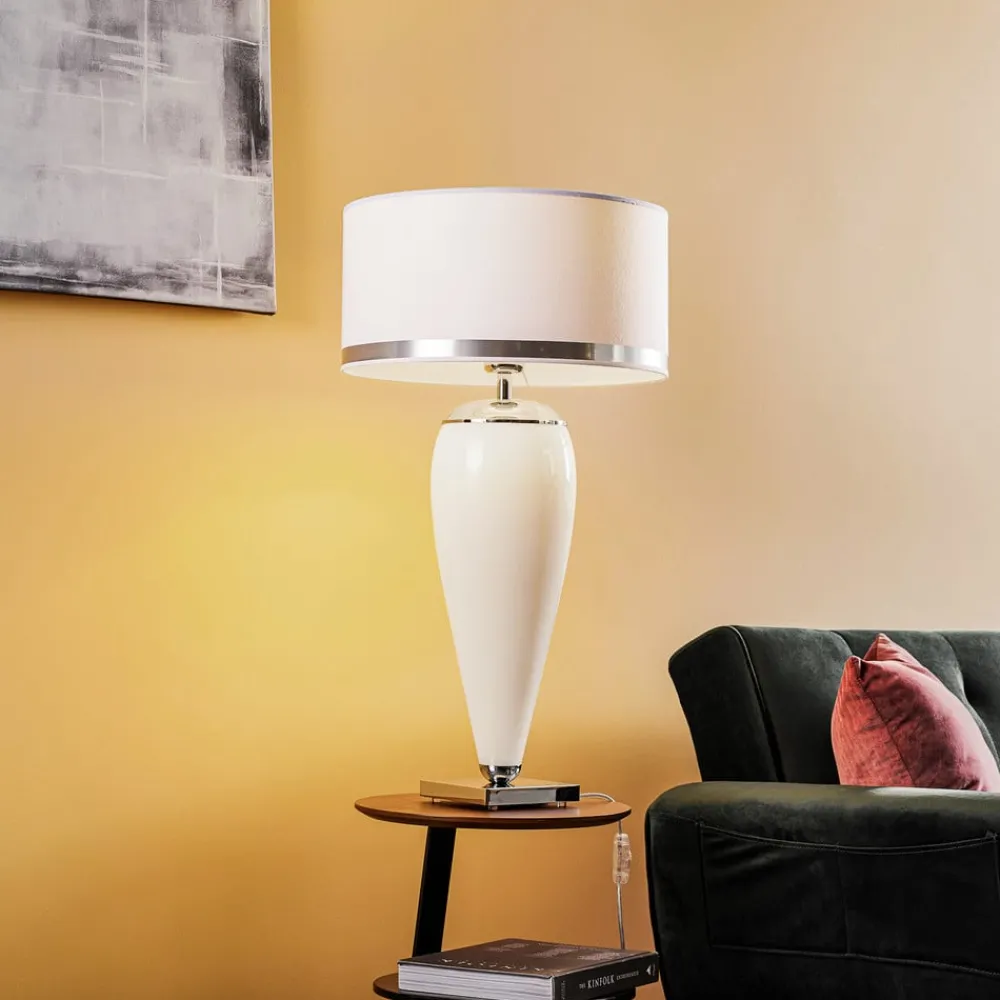 Bordlampen Lund kombinerer moderne design med materialer av høy kvalitet og tilbyr en stilfull belysningsløsning til ulike oppholdsrom. Lampen er laget av en harmonisk kombinasjon av tekstil, glass og stål og passer perfekt inn i moderne interiørstiler. Fargene hvit, opal og krom gir lampen en tidløs eleganse som setter accenter både i stuen, soverommet og spisestuen.