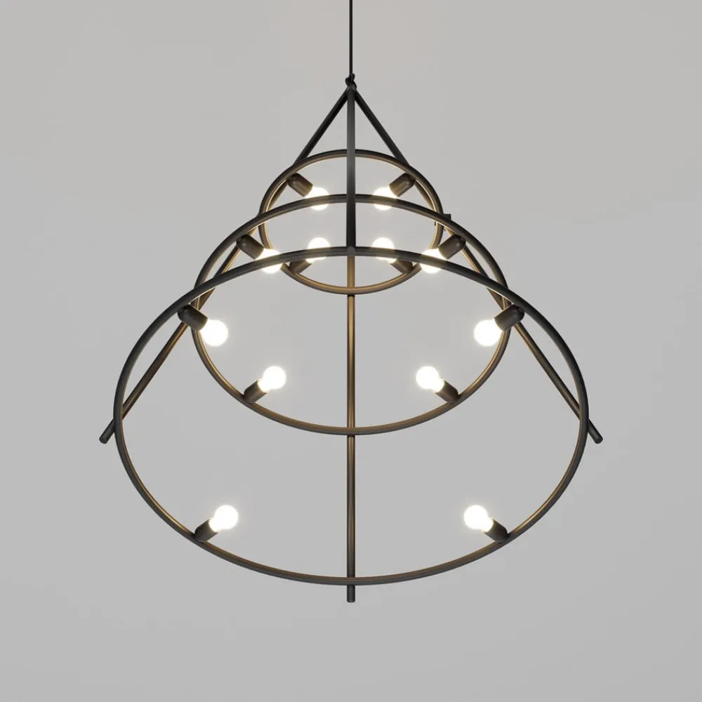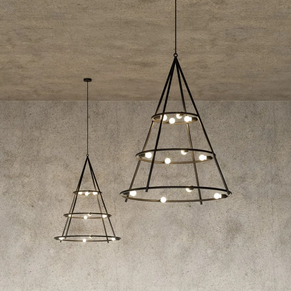 Moderne lysekrone El Porís består av en stabil, stiv struktur og imponerer med sitt elegante og stilrene utseende. De svarte metallstiverne danner basen som en kjegle, og på denne er det integrert tre ringer av ulik størrelse som inneholder de tolv fatningene. Stikkontaktene er festet på innsiden og er derfor rettet innover og vendt mot hverandre. Den geometriske strukturen med sine uvanlig store dimensjoner kombinerer moderne design med tradisjonelle lyskilder, noe som gir deg frihet til å velge lyskilde. Orienteringen skaper et stemningsfullt, altomfattende lysbilde som bærer lysstyrken inn i rommet. Armaturen ble skapt i 2007 av designerne Herzog & de Meuron som en skisse til et husprosjekt på Tenerife. Arbeiderne på stedet produserte den i forskjellige versjoner, og det som opprinnelig var ment som et midlertidig inngrep, ble et viktig element i rommet. Frem til 2020 var pendelarmaturen El Porís et unikt element som kaster et behagelig, men ganske intenst lys på veggen med en tiltalende skygge som en tegning.