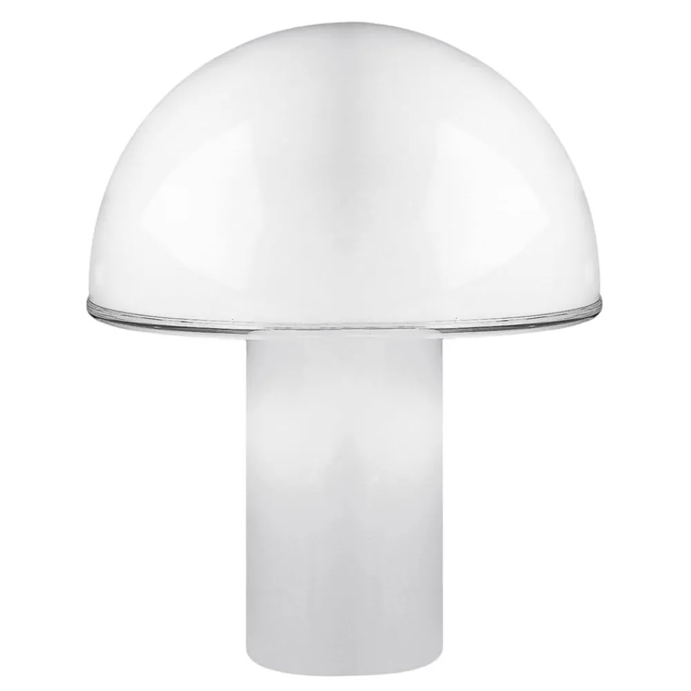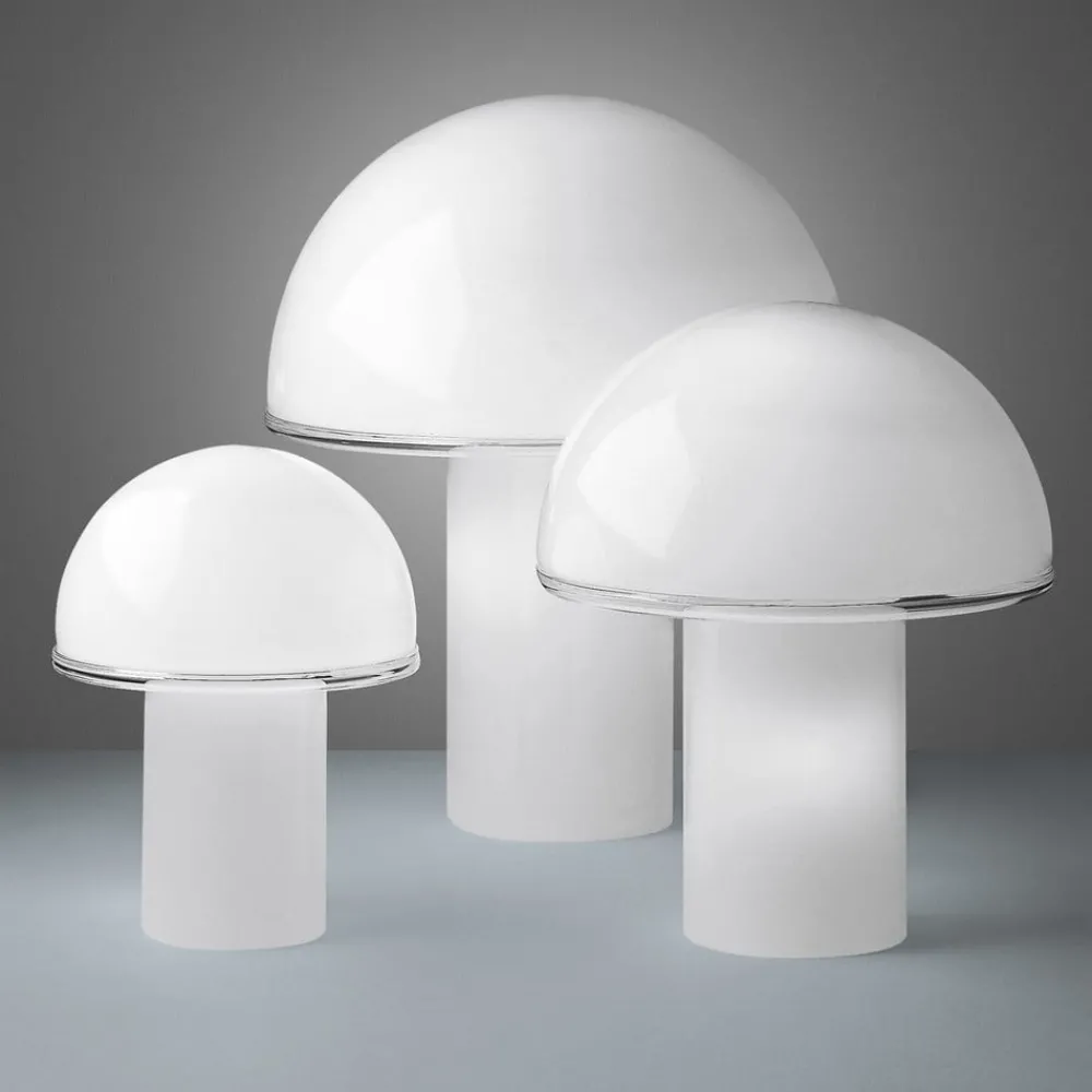 Bordlampe Onfale i gjennomskinnelig glass Bordlampen Onfale er noe helt spesielt. Den gir ikke bare ekstra belysning i stuen og passer til mange moderne møbler, men er også et enestående dekorativt tilbehør. Sokkel og skjerm har samme utseende: Begge er laget av munnblåst opalglass, mens kanten på skjermen er laget av gjennomsiktig krystallglass. Onfale er designet av den italienske designeren Luciano Vistosi, som bor i Venezia og arbeider på øya Murano. Vistosi kom fra en venetiansk familie som eide glassfabrikker og produserte industriprodukter. Etter farens død i 1952 grunnla han Vetreria Vistosi sammen med sin onkel og bror. De ønsket å produsere lamper med moderne design. Fra slutten av 1960-tallet fokuserte Vistosi på glassblåsing og ble en viktig skikkelse på den italienske kunstscenen. Han designet bordlampen Onfale for det anerkjente italienske belysningsselskapet Artemide, som er representert i over 98 land og er kjent for sine høykvalitetsprodukter.