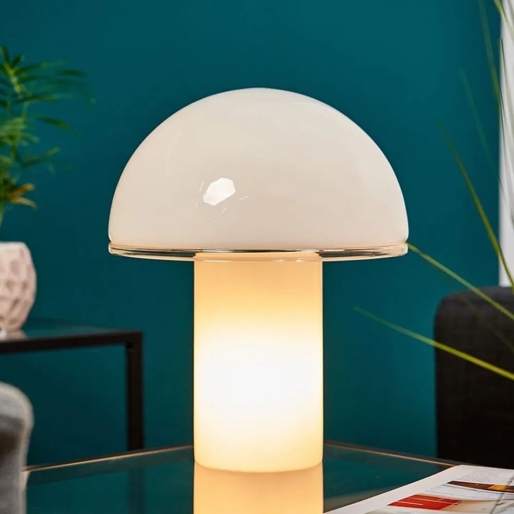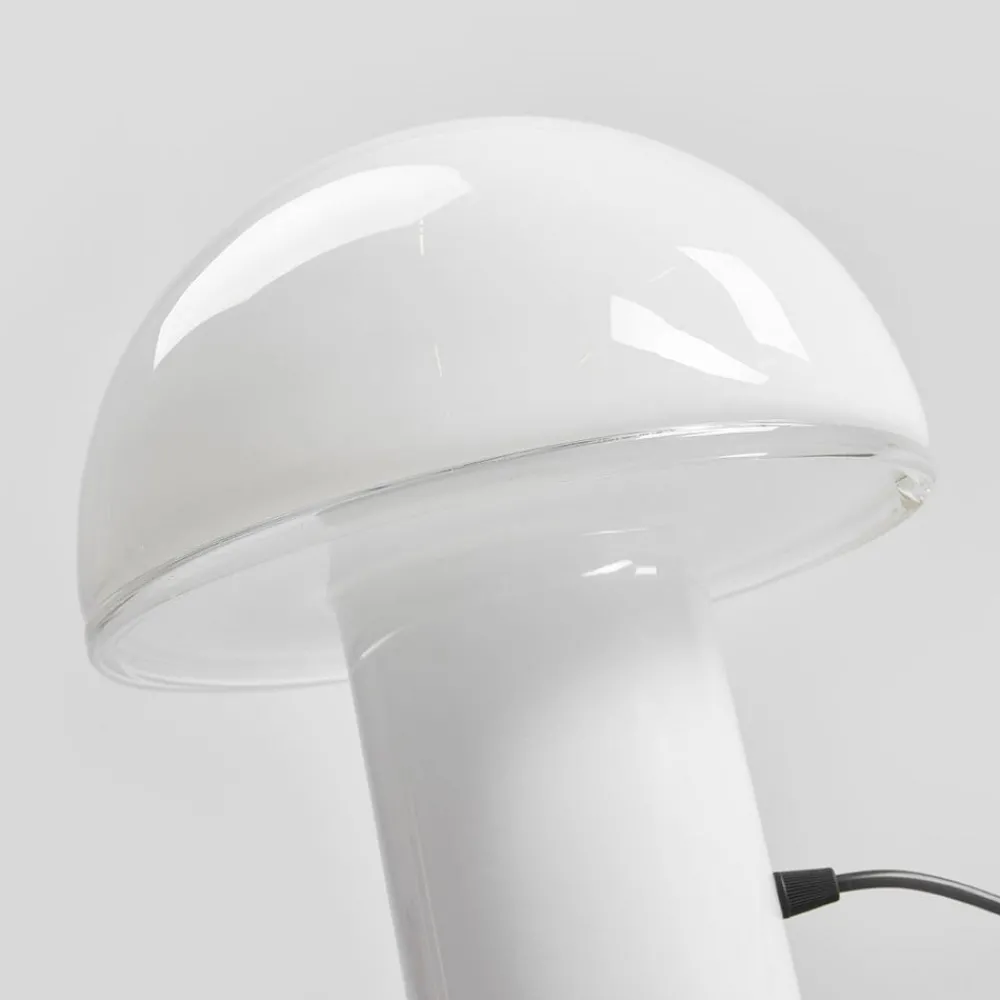Designet og teknikken som er brukt på bordlampen Onfaler er tidløs. Dette beviser lampen ved at den ble designet og serieprodusert allerede i 1978, men er like moderne og stilig i dag som den gang. Et stort bidrag til dens klassiske skjønnhet yter både materialet og formen. Helt fri for dill-dall og formet som en sopp er den alltid moderne og kan berike de fleste innredningsstiler. Også med glass som materialvalg skårer bordlampen når det gjelder tidløshet. Både foten og skjermen er laget av munnblåst opalglass. På randen av den halvkuleformede skjermen er det en tynn ring av klart glass. Hele lampen har to forskjellige lyspærer, en i skjermen og en i foten. Begge lyskildene kan brukes individuelt.