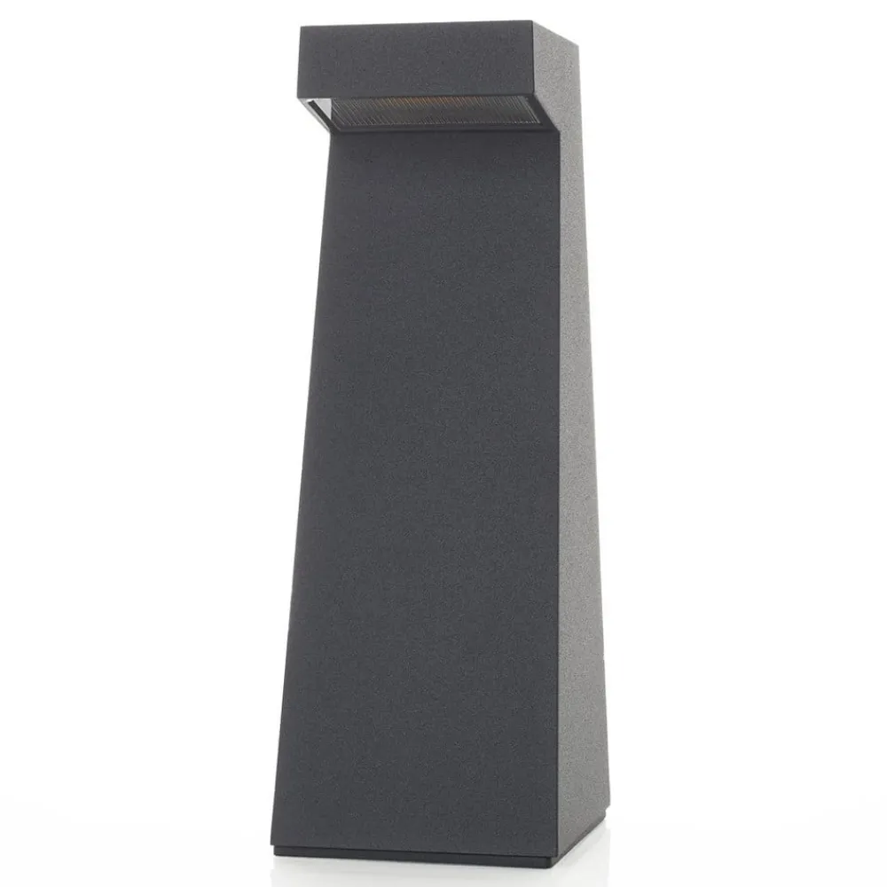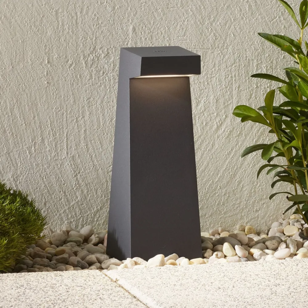 Bakkenær belysning for veier og inngangspartier. Grafittgrå LED-sokkellampe 77276/84108 fra BEGA. Den moderne kroppen er laget av aluminium og rustfritt stål, og sprederen er laget av herdetglass. Lampen er skjermet oppe, slik at lyset kun slipper ut i bakkeretning, noe som sikrer en belysning av stier og terrasser uten at noen blendes. Bakkefeste, jordspyd av galvanisert stål (inkl.)