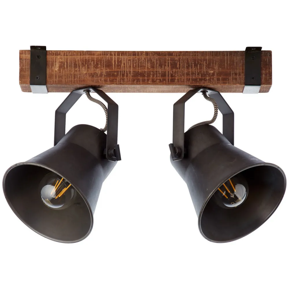 Denne kompakte taklampen har to svingbare spotter for optimal belysning av rommet. Tre- og stålelementer er vevd inn i et helhetlig konsept som utstråler industriell sjarm.