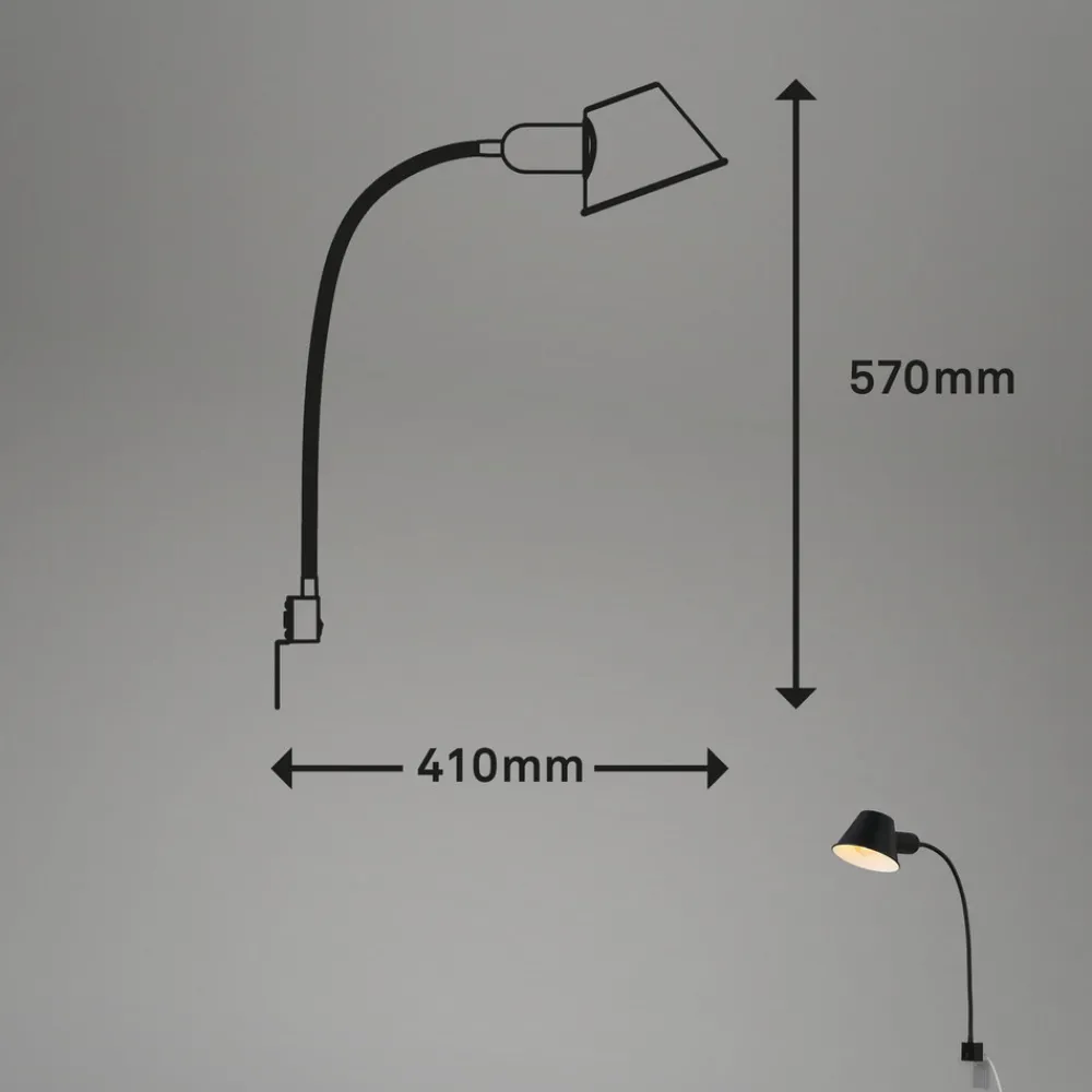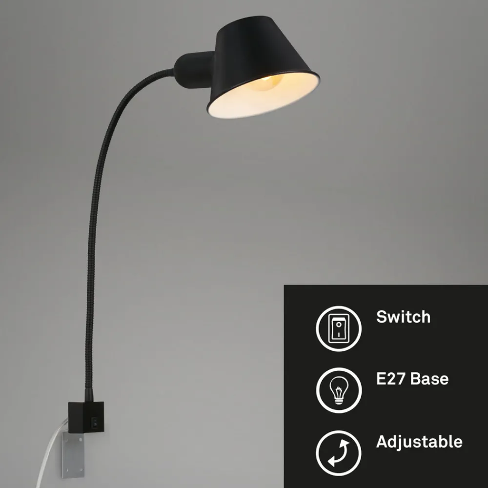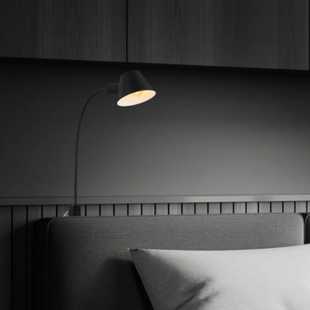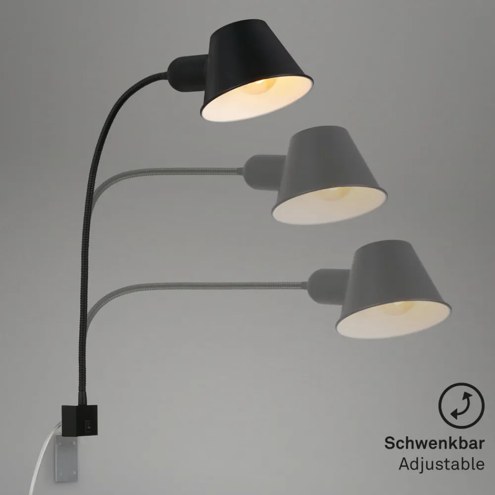 Brello vegglampe med fleksibel arm, bryter og utvendig skruefeste Brello vegglampe er spesielt imponerende som leselampe ved sengen eller sofaen, der den gir justerbart lys takket være den fleksible armen. Skjermen er utformet i den tidløse formen til en avkortet kjegle og har fatning E27 (uten pære). Den fleksible armen springer ut fra en kubeformet Basis, som også er utstyrt med en av/på-bryter og har inngang for støpselkabelen på baksiden. Brello er utstyrt med et flatt skruefeste, som er beregnet for montering på veggen, f.eks. bak sengens hodegjerde.