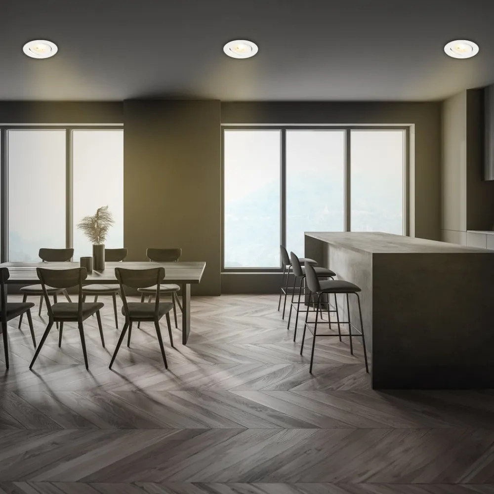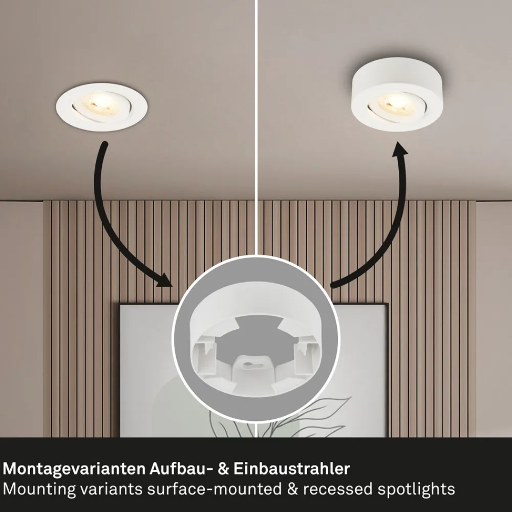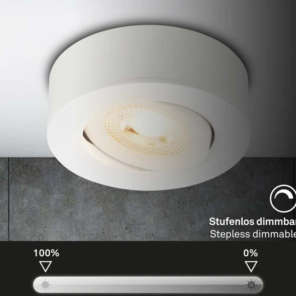 Praktisk Desi LED-lampe – kan brukes som innfellings- eller påbyggingslampe Den lille, runde Desi LED-lampen kan brukes både som innfellingslampe og som påbyggingslampe. Den kan dimmes fra utsiden og kan svinges. Den kan brukes i nesten alle rom i huset.