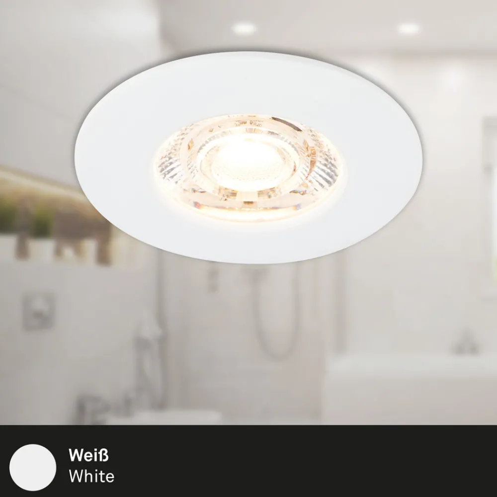 Rund LED-innbyggingsarmatur Kulana Mini, varmhvit, IP44, sett med 3Kulana Mini er en moderne, energieffektiv erstatning for konvensjonelle halogeninnbyggingsspotter. Den runde innfelte spotlighten har en varmhvit LED-lyskilde og en plastramme. Kulana Mini egner seg ikke bare til stuer og oppholdsrom, men også til bad og spa takket være sprutvannsbeskyttelsen. Beregnet for montering i 5 til 15 mm tykke tak, utstyrt med monteringsfjærer. Tre innfelte armaturer er inkludert i leveransen.
