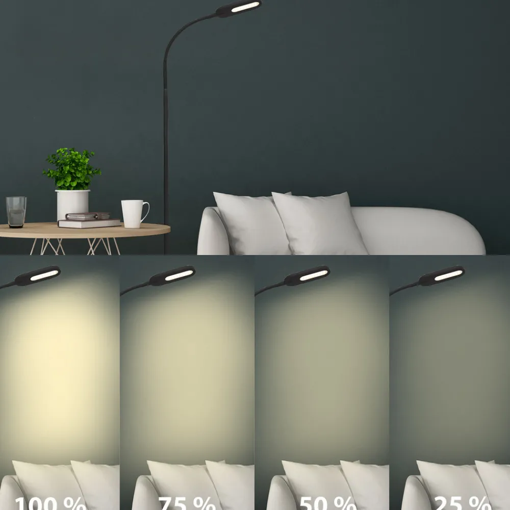 Office Step LED-gulvlampe – trinnvis dimbar med berøringsbryter Office Step-gulvlampen er ideell som leselampe i stuen eller på soverommet, siden lyset er rettet nedover. Den tar liten plass, men gir tilstrekkelig med lys. Den markante, stilrene formen og den svarte fargen passer til nesten alle møbler. Lampen har trinnløs dimming av lysstyrken, som kan justeres etter behov ved hjelp av berøringsbryteren. Berøringsbryteren kan også brukes til å velge mellom tre ulike lysfarger (varmhvit 3 000 K, universalhvit 4 00 K eller dagslys 6 500 K) – Armaturhodet kan roteres 360 grader