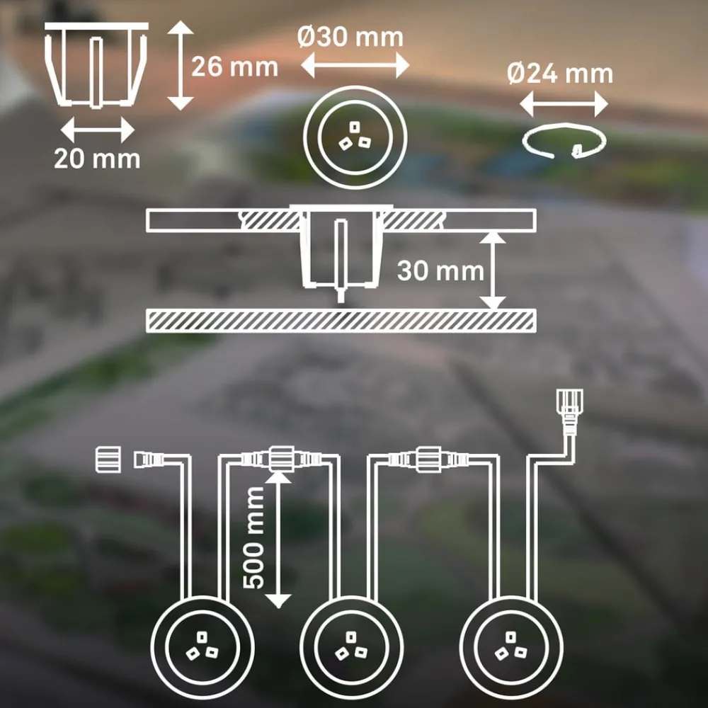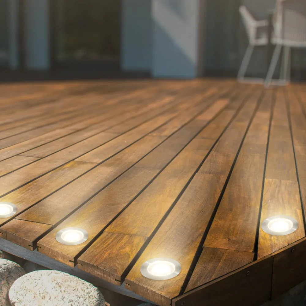 Dette settet med tre varmhvite LED innfelte spotlights brukes til å utvide Briloners 12 V utelyssystem. De runde spotene har rustfritt stålhus og plastdeksel og har passende tilkoblingskabler med pluggkontakter for 12 V-systemet. En utendørs pluggtransformator for 230 V tilkobling til stikkontakten er ikke inkludert – det er nødvendig med et startset (se tilbehør).