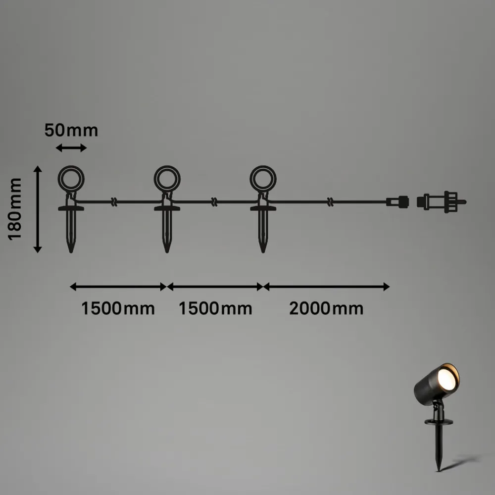 - tre lamper med jordspyd (24 V) med inngangskabel (24 V) og utgangskabel (24 V), en utendørs pluggbar strømforsyningsenhet (230 V) med utgangskabel (24 V)