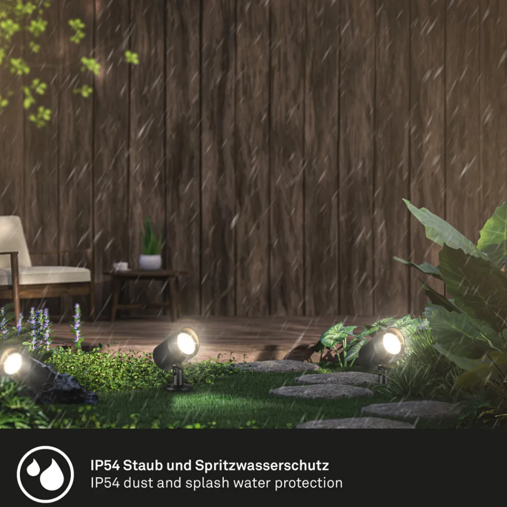 Svingbar LED-spot med jordspyd Ø 5 cm i et komplett sett med 3 stk Dette komplette settet inneholder tre varmhvite LED-spotter med jordspyd, en utendørs plug-in-transformator og tilkoblingskabler. De runde spottene kan svinges inn i rammen, og de runde spottene kan enkelt forankres i asfaltert underlag ved hjelp av jordspydet – Komplett sett med tre lamper, 24 V tilkoblingskabler og 230 V til 24 V IP44 plug-in strømforsyning (maks. 6 W) – Kapslingsgrad: IP54