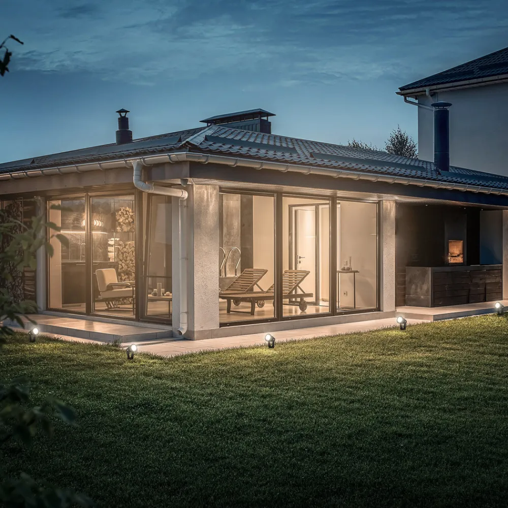 Forlengersett for 12 V utelamper – tre runde LED-spot med jordspyd Ø 5 cm Dette settet med tre varmhvite LED-spot med jordspyd brukes til å forlenge 12 V LED-utelampen fra Briloner. Det runde lampehodet er svingbart montert i rammen. Jordspydet gjør det enkelt å forankre spotlightene i løs jord. Spottene har egnede tilkoblingskabler med pluggkontakter for 12 V-systemet. En utendørs plug-in-transformator for 230 V-tilkobling til stikkontakten er ikke inkludert – et startsett (se tilbehør) er nødvendig – Forlengelsessett med tre lyskastere og 12 V-tilkoblingskabler – Eksklusiv plug-in-transformator – Kapslingsgrad: IP65