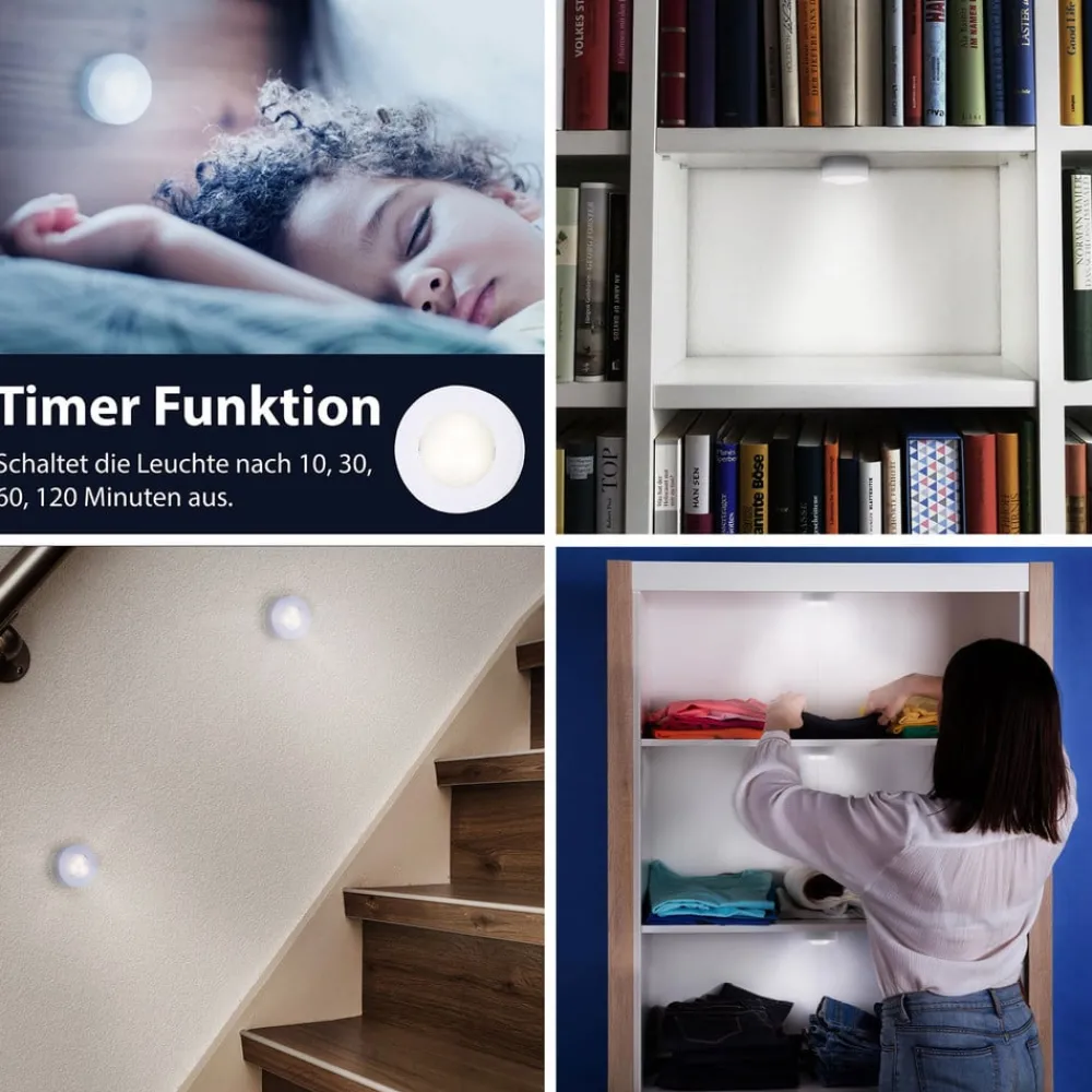 Hvit LED-skaplampe Cabinet i sett med 6 stk. De seks Cabinet LED-skaplampene kan monteres på ønsket sted ved hjelp av 3M selvklebende pads. Lysene kan slås på med fjernkontrollen eller berøringsbryteren. Takket være den intelligente timerfunksjonen kan lysene justeres individuelt etter behov. De enkle, hvite plastlampene kan integreres i ethvert skap, både når det gjelder design og farge. Det betyr at de til enhver tid er optimalt opplyst. Lampene er enkle å montere og er ikke visuelt påtrengende. Fokuset ligger utelukkende på det behagelige lyset, som også kan dimmes trinnvis for å sikre riktige lysforhold til enhver tid.