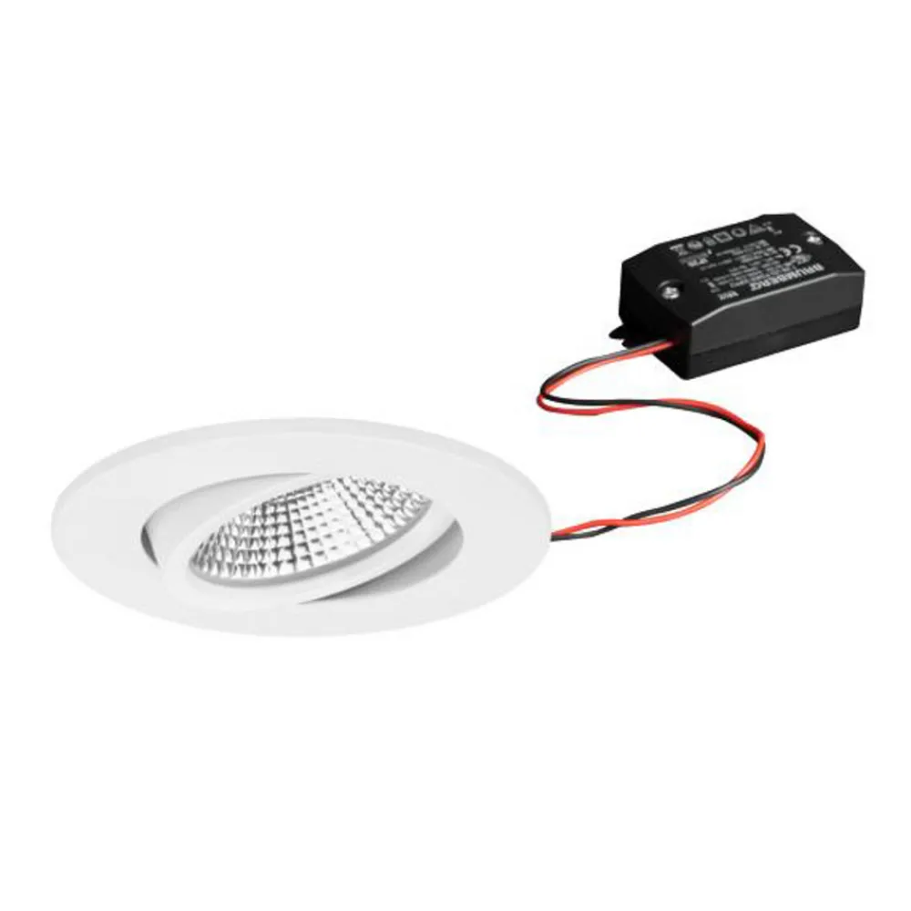 LED-innbyggingsspotlight BB23 med innkoblingsbar LED-driver og IP65, svingbar For baderom, velværerom og mange andre fuktige rom i privat eller kommersiell sektor er denne LED-downlighten BB23, som kan svinges 15° rundt, støvtett og beskyttet mot vannstråler med kapslingsklasse IP65. Den kan monteres uten verktøy ved hjelp av monteringsfjærer, kan monteres i tak med en tykkelse på opptil 1,7 cm og er ikke dimbar. Downlighten avgir varmhvitt lys i en vinkel på 36° og fordeles optimalt av den sølvfargede reflektoren med rotasjonssymmetrisk, dyp lysfordeling gjennom det transparente plastdekselet.