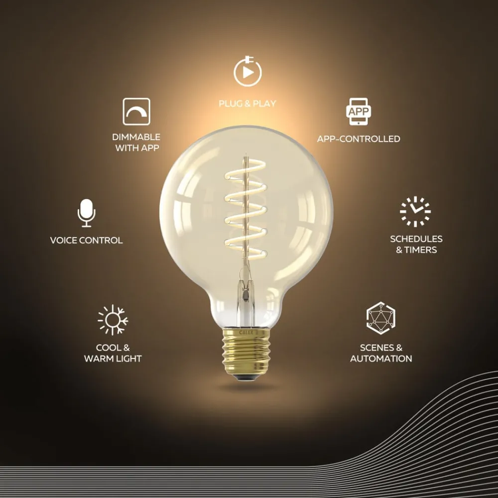 Med dette settet med 2 smarte LED-filamentpærer i vintage-stil kan du berike ethvert hjem. Den gullbelagte glasset på denne globepæren gir en spesielt koselig lysstemning, og det vakre utseendet gjør pæren perfekt for lamper uten skjerm eller åpne og gjennomsiktige skjermer. Via Calex-appen kan lyset fleksibelt justeres fra kjølig hvitt til ekstra varmhvit for avslappende øyeblikk – selvfølgelig også dimbar og fullt tilpassbar på avstand.
