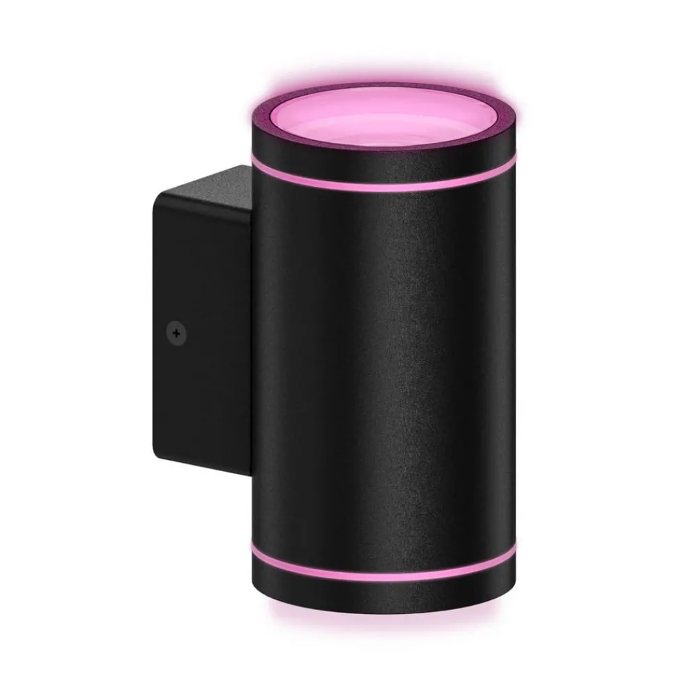 Intelligent lysstyring: LED utendørs vegglampe Smart Outdoor Up & Downlight, CCT, RGB Den moderne designen til LED utendørs vegglampen Smart Outdoor Up & Downlight sender det genererte lyset både oppover og nedover, noe som skaper et grasiøst mønster på veggen. Mer enn 100 lysfarger kan stilles inn ved hjelp av appen. Det er også mulig å stille inn hvite toner (2 700 K – 6 500 K). Smart Outdoor Up & downlight kan selvfølgelig også enkelt kobles og dimmes via appen. Timere og forhåndsinnstilte lysscener er også tilgjengelige, og det er også mulig å styre med stemmekommandoer, ettersom Calex-appen er kompatibel med Amazon Alexa, Siri Shortcuts og Google Assistant. Det kreves en Calex Smart Outdoor Link Bluetooth Mesh Gateway, som kan kjøpes separat via tilbehøret. Ettersom selve gatewayen er integrert via Wi-Fi, må et Wi-Fi-hjemmenettverk være tilgjengelig. Forbindelsen til lyset opprettes deretter via Bluetooth. Tekniske funksjoner / kompatibilitet: – Kan styres via Calex-appen (gratis for Android og iOS) – Over 100 lysfarger og justerbart hvitt lys: varmhvit (2 700 K) – dagslys (6.500 K) – Timer og forhåndsinnstilte scener kan stilles inn via app – Stemmestyring mulig med Amazon Alexa, Google Assistant og Siri Shortcuts – Dimbar via app eller stemmekommando Merk: En Calex Smart Outdoor Link Bluetooth Mesh Gateway (se tilbehør) og et eksisterende Wi-Fi-nettverk er nødvendig for intelligent lysstyring.