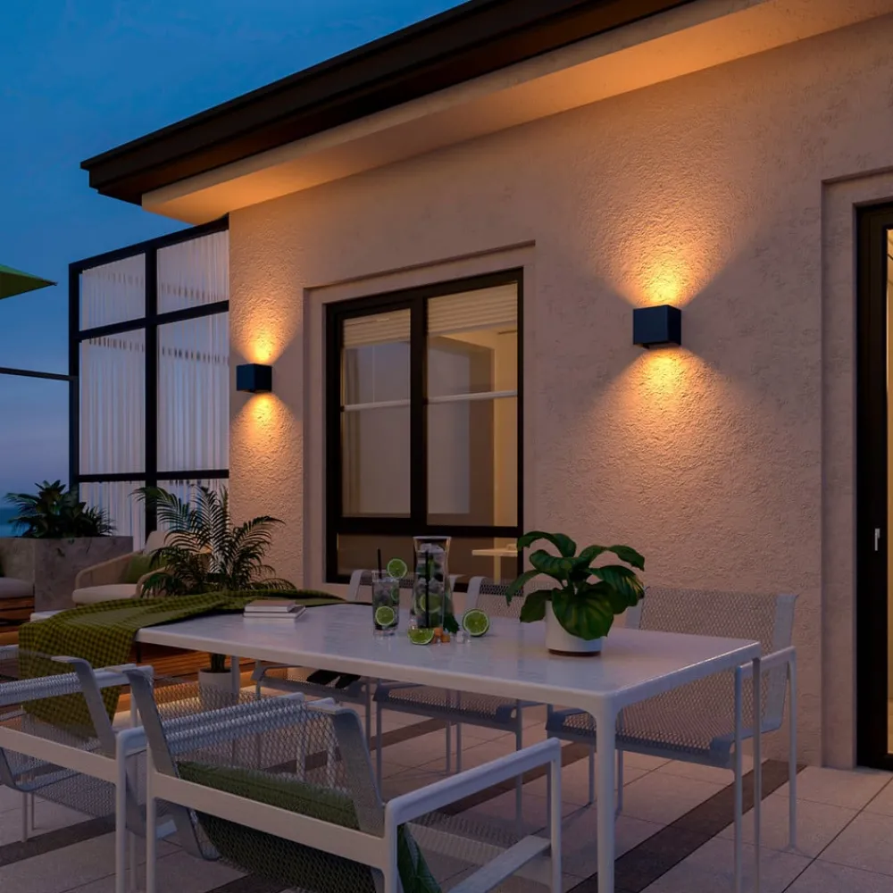 Utendørs vegglampe Cube er beregnet på moderne aksent- og orienteringsbelysning på fasader og inngangspartier. Huset er laget av aluminium og plast i en enkel kubform og har en ensfarget overflate. To varmhvite LED-lyskilder er integrert og beskyttet bak plastdeksler, og lyset stråler oppover og nedover.
