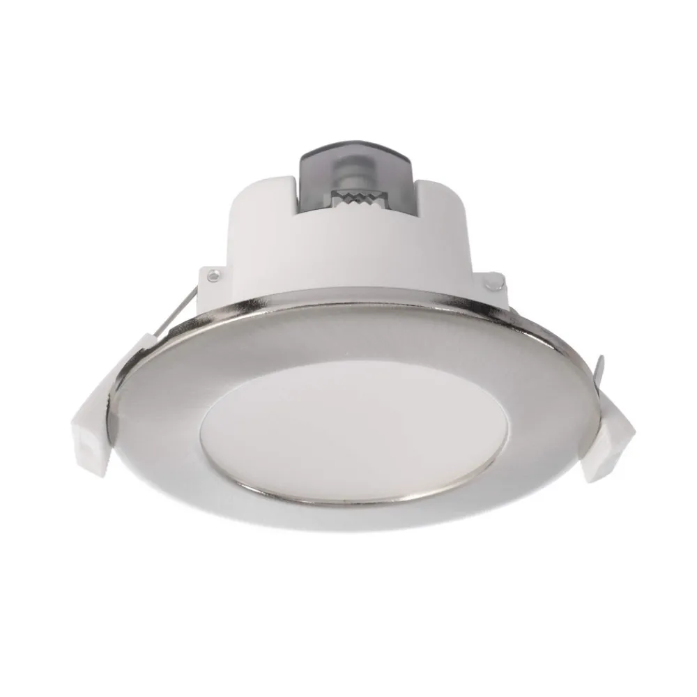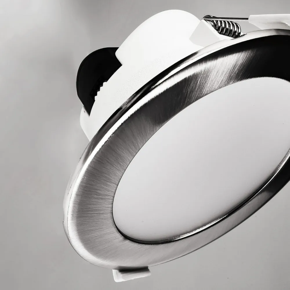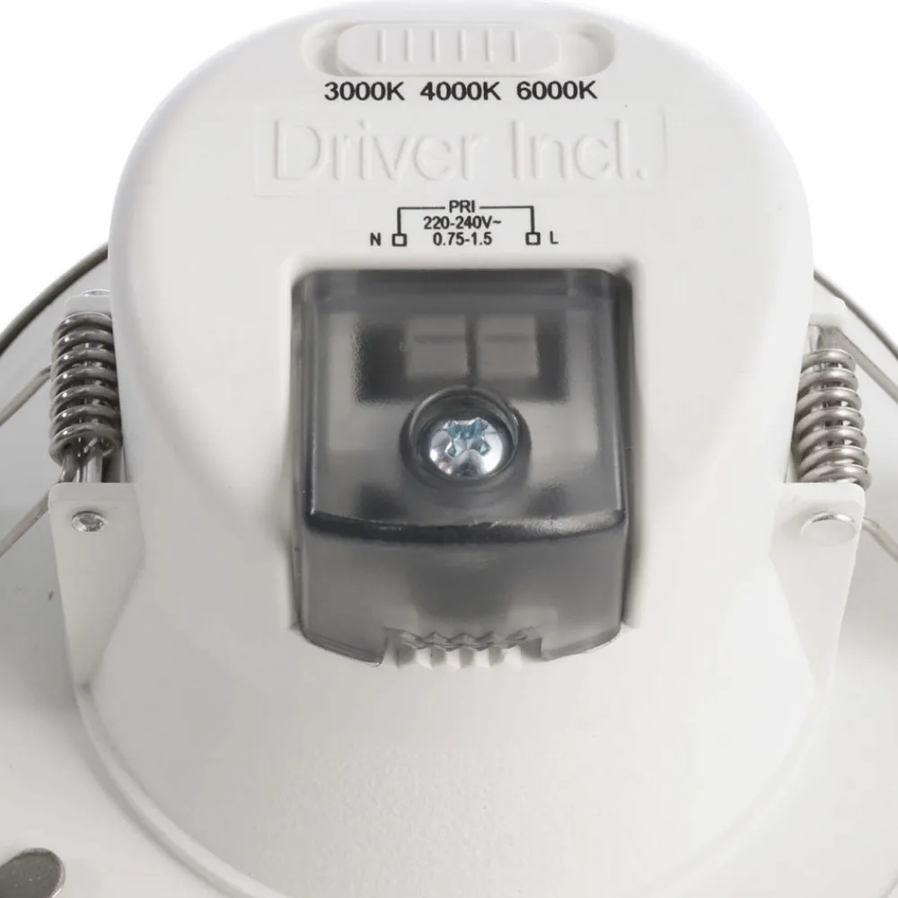 Rund innfelt LED-taklampe Acrux med bryter for regulering av lystemperatur Før installasjon kan lystemperaturen på Acrux justeres ved hjelp av en bryter på baksiden, noe som gjør den egnet til bruk i mange forskjellige områder. Du kan velge mellom varmhvit, universalhvit og dagslys. Armaturen kan også dimmes ved hjelp av en faseavsnittdimmer, noe som gir enorm fleksibilitet. Acrux er laget av hvit plast og leveres med et sølvfarget deksel som enkelt kan tas av ved behov. Den integrerte diffusoren reduserer blendingen av lyset og skaper en behagelig atmosfære. 90° spredningsvinkel – Lysfarge kan stilles inn før installasjon ved hjelp av en bryter