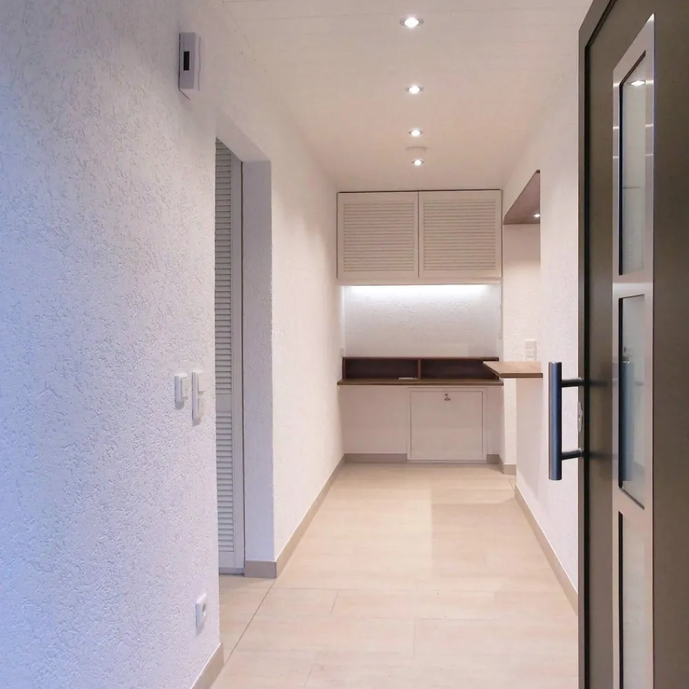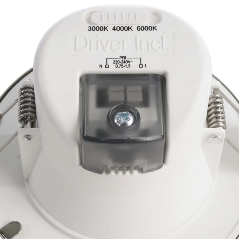 Rund innfelt LED-taklampe Acrux med justerbar fargetemperatur Acrux er laget av hvit plast og leveres med en dyp svart dekkring. Den innfelte LED-taklampen er egnet for 230 V direkte tilkobling og kan brukes til mange formål: på kjøkkenet, i trappeoppgangen eller i gangen samt til butikk- eller korridorbelysning i kommersielle områder. Fargetemperaturen kan velges i tre trinn via en dip-bryter i lysfargene varmhvit, universalhvit og dagslys. For å holde strømforbruket lavt er det installert SMD-lysdioder med høy ytelse. Lyset kan også dimmes ved hjelp av en faseavsnittdimmer i forkant eller etterkant som leveres av kunden – Utstrålingsvinkel: 90° – Oppstartstid 60 % lysfluks: 0,5 s – Tenntid: 0,5 s – Lysavgivelse: symmetrisk – Driftsmodus: konstant spenning – Driftstemperatur: -5 °C – +40 °C – Ytelsesfaktor PF: 0,90 – Lysstyrke: 505 cd