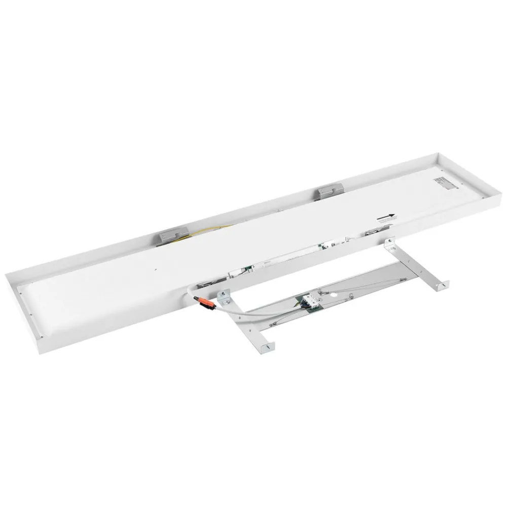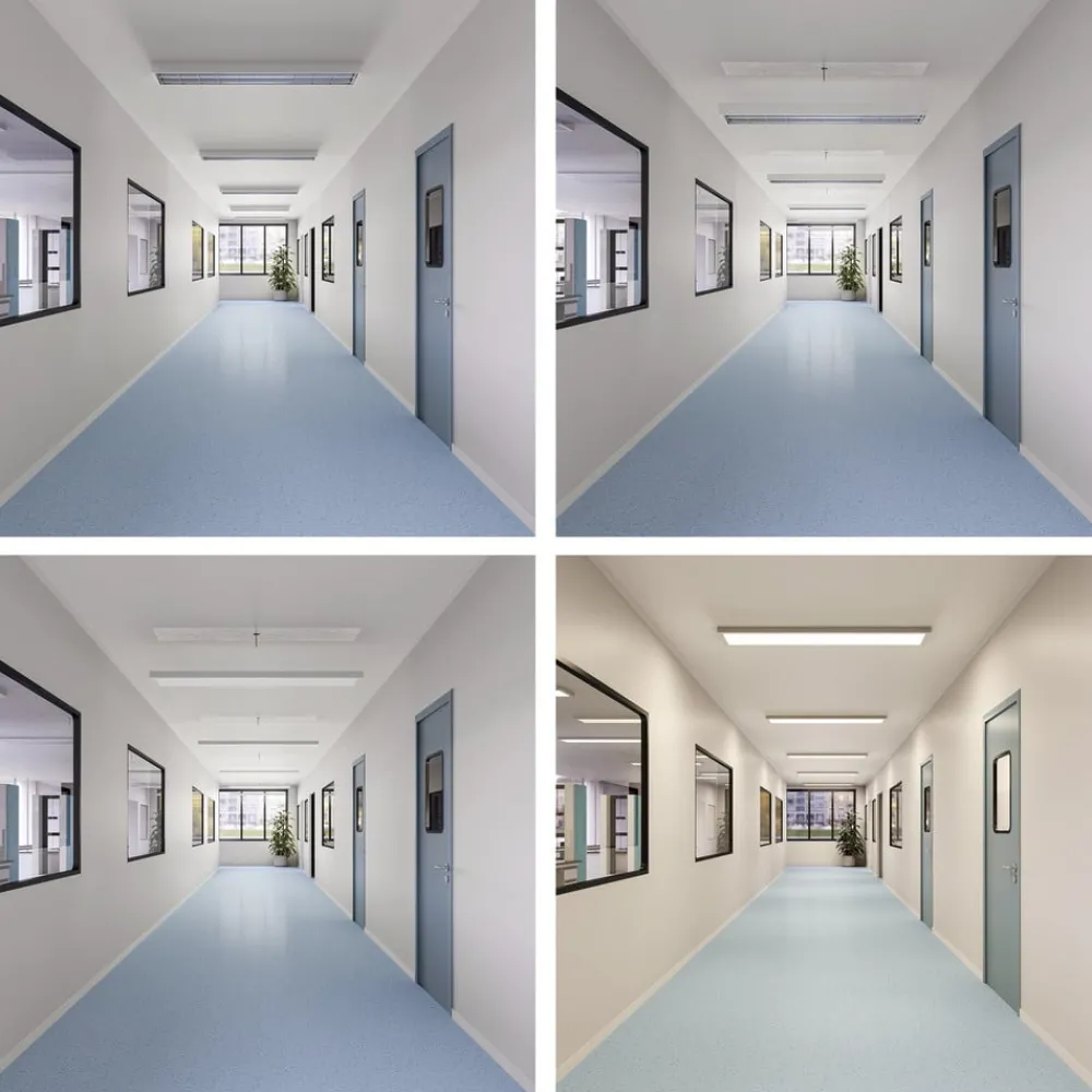 PRO OFFICE SANO kantet LED-panel for takmontering – med CCT-bryter, DALI-kompatibel PRO OFFICE SANO LED-panel med hvit, rektangulær aluminiumsramme og mikroprismatisk avskjerming er ideelt for arbeids- og allmennbelysning i kontorer. Takket være svært god avblending, valgbar lysfarge, ukomplisert installasjon og integrering i et DALI-lysstyringssystem er PRO OFFICE SANO panelet spesielt allsidig – Oppussingsløsning for T5 / T8 rasterlamper – Ingen ommaling nødvendig takket være tildekking av gammel installasjon – Enkel installasjon takket være plug-in-tilkobling, sikkerhetskabler og monteringsbrakett – Valgbar lysfarge før idriftsettelse: 3.000 K / 4 000 K – Styring: Intelli Push-Dim, Dimbar, DALI 2.0 / DT6 – Nødstrømkompatibel [176-280V/DC EOFI: 95 %] – Egnet for arbeidsstasjoner med skjermer i henhold til EN 12464-1 BAP65 [L65=3000cd/m²]