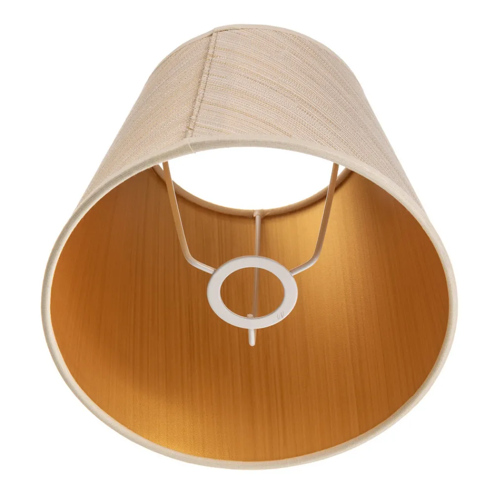 Lampeskjermen Sofia imponerer med sin elegante kombinasjon av hvitt og gullstripete tekstil, som gir hvert rom et spesielt preg. Den nøye utførelsen og bruken av høykvalitetsmaterialer understreker kvaliteten og holdbarheten til dette produktet. Den harmoniske fargen gir et behagelig lysspill som kan virke både beroligende og inspirerende.
