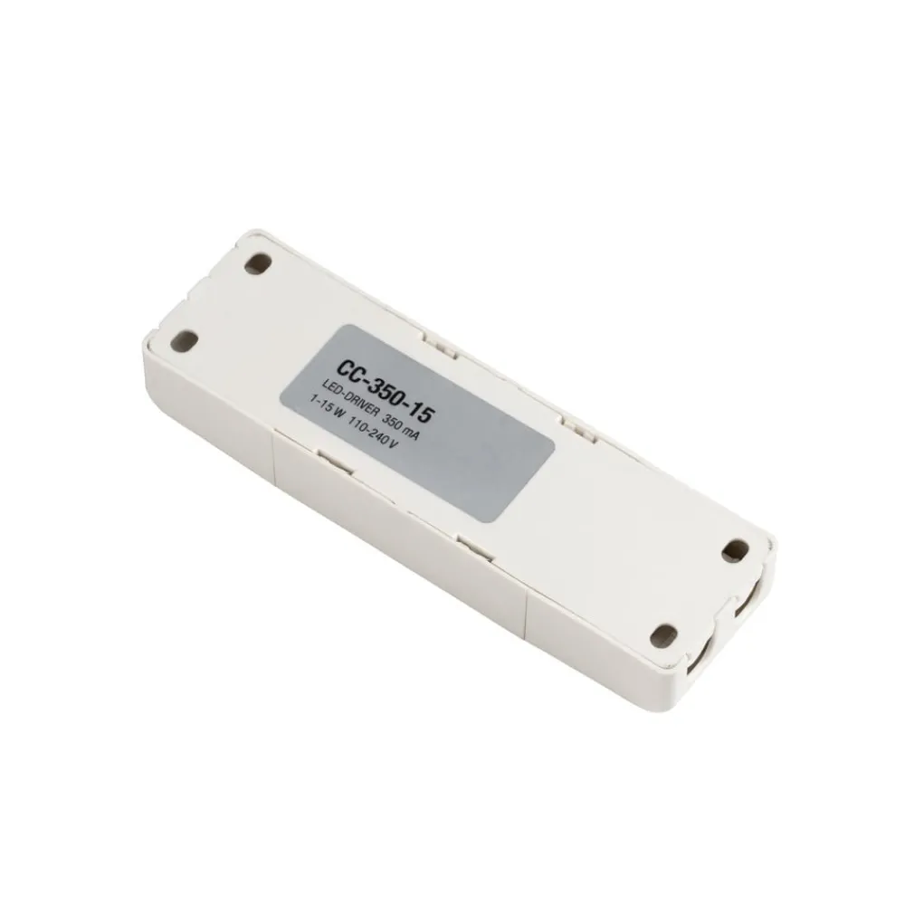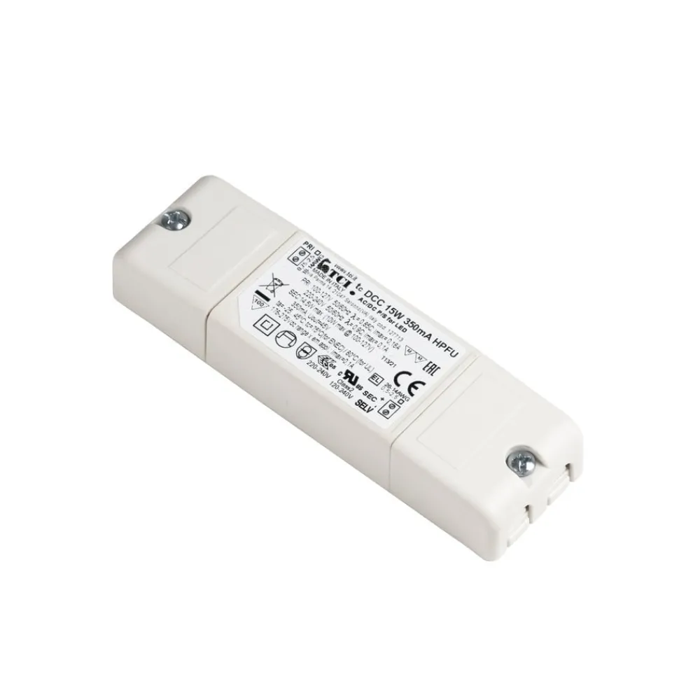 LED-driver med konstant strøm 350 mA Denne LED-driveren for innendørs bruk er egnet til å forsyne LED-lys med en samlet effekt på 1 til 15 W, som drives med en konstant strøm på 350 mA. Driveren er ikke dimbar.