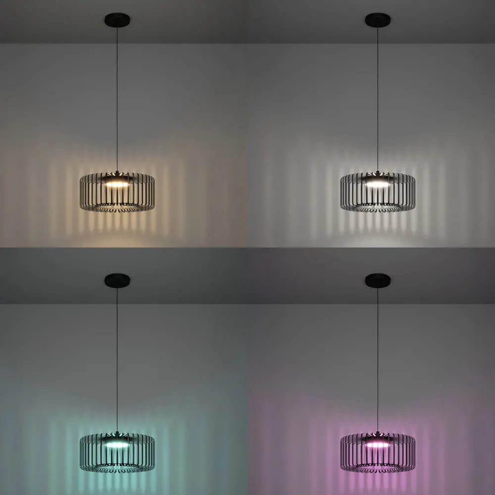 LED-hengelampe Ginestrone-Z EGLO connect, RGB, CCT, LED-hengelampen Ginestrone-Z fra connect.z smart home-serien har en rund skjerm laget av svarte, flate metallstrimler med en innvendig LED-profil bak hvit plast. Metallstrimlene skaper et fascinerende samspill mellom lys og skygge så snart lampen slås på. De integrerte LED-lampene gir behagelig lys etter behov. Du kan velge mellom varmhvit, universalhvit og dagslys-hvit belysning og en rekke RGB-lysfarger. Lyset styres via gratisappen (AwoX Home Control) og gir tilgang til ekstra komfortfunksjoner som dimmer, timer, tilstedeværelsessimulering og mye mer. Den styres via Bluetooth og ZigBee 3.0 og kan også styres via kompatible stemmeassistenter. Som et alternativ til appen kan den smarte pendellampen også styres ved hjelp av en fjernkontroll som fås separat. Hengelampen passer perfekt inn i moderne interiør.