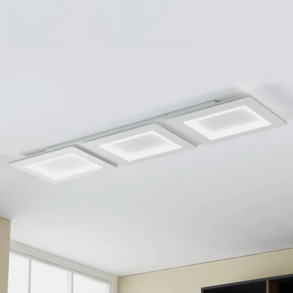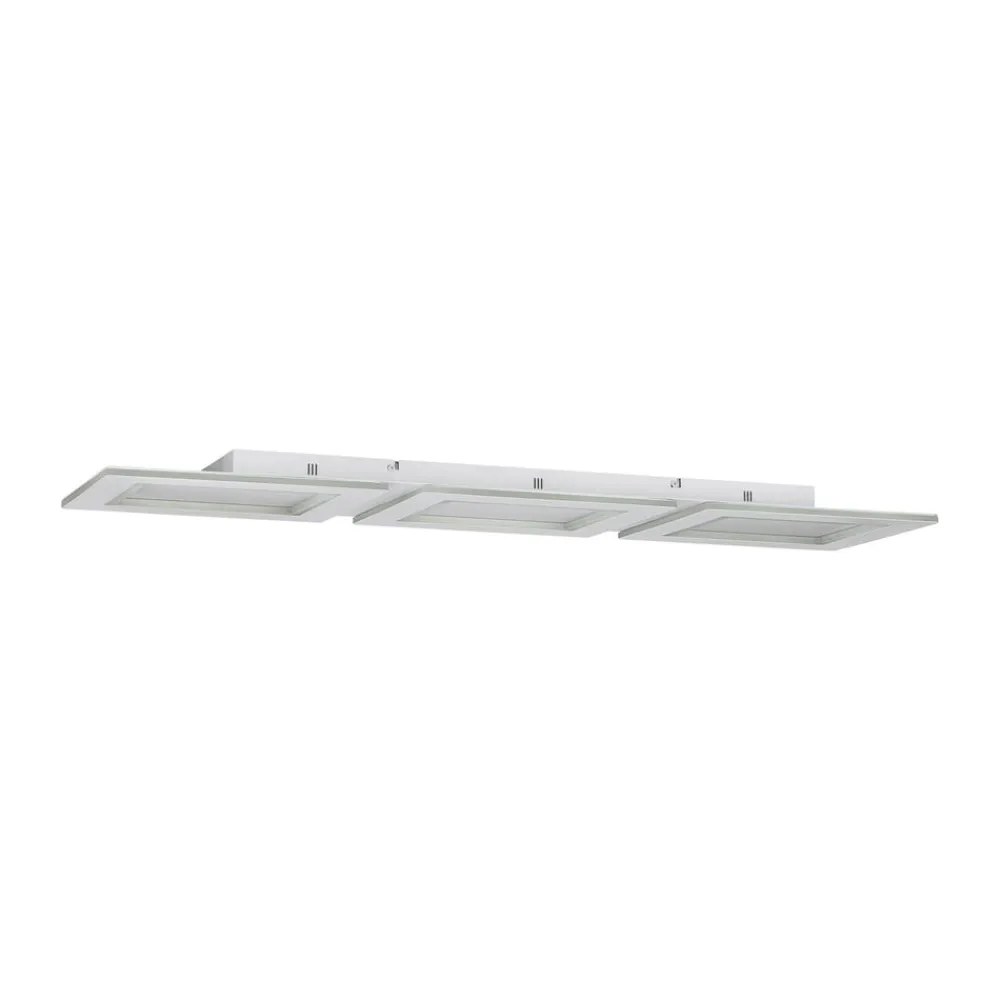 LED-taklampe Padrogiano-Z EGLO Connect, 3 lyskilder, rektangulær Den rektangulære LED-taklampen Padrogiano-Z fra connect.Z smart home-serien er laget av hvitt metall og tre hvite plastfirkanter. LED-lampene som er integrert i de indre ringene og på ytterkantene av de tre rutene, gir et behagelig lys etter ønske. Lyset i rutene kan varieres mellom varmhvit, universalhvit og dagslys-hvitt lys, mens lyset fra LED-lampene som er innebygd i kantene på rutene, gir en rekke RGB-lysfarger. Både den ytre og den indre ringen kan slås av og på og dimmes separat. Padrogiano-Z taklampe styres via en gratis app (AwoX Home Control), som også gir tilgang til andre praktiske funksjoner som dimmer, timer, tilstedeværelsessimulering og mye mer. LED-panelet styres via Bluetooth og ZigBee 3.0 og kan også styres via kompatible stemmeassistenter. En alternativ form for kontroll er en fjernkontroll som er tilgjengelig som tilbehør. Taklampen passer inn i en rekke ulike interiørstiler og gir en svært fleksibel og stemningsfull belysning i en rekke rom.