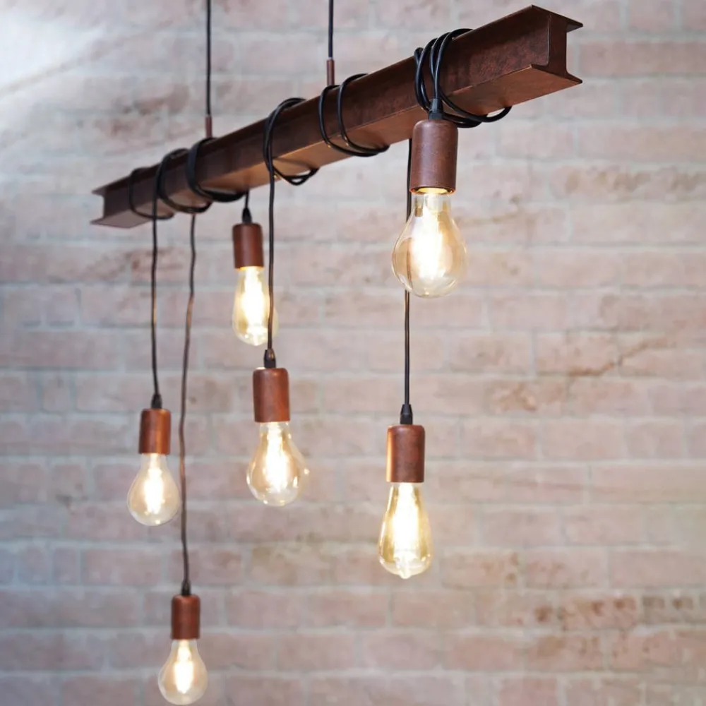 Den brune pendellampen består av et avlangt feste som minner om en stålbjelke, noe som skaper et industrielt uttrykk. Flere ledninger slynger seg tett omkring bjelken og munner ut i seks lyskilder (ikke inkludert). Slik oppstår et strålende lysbilde som gjør seg ekstra godt over spisebordet eller over en kjøkkenøy.