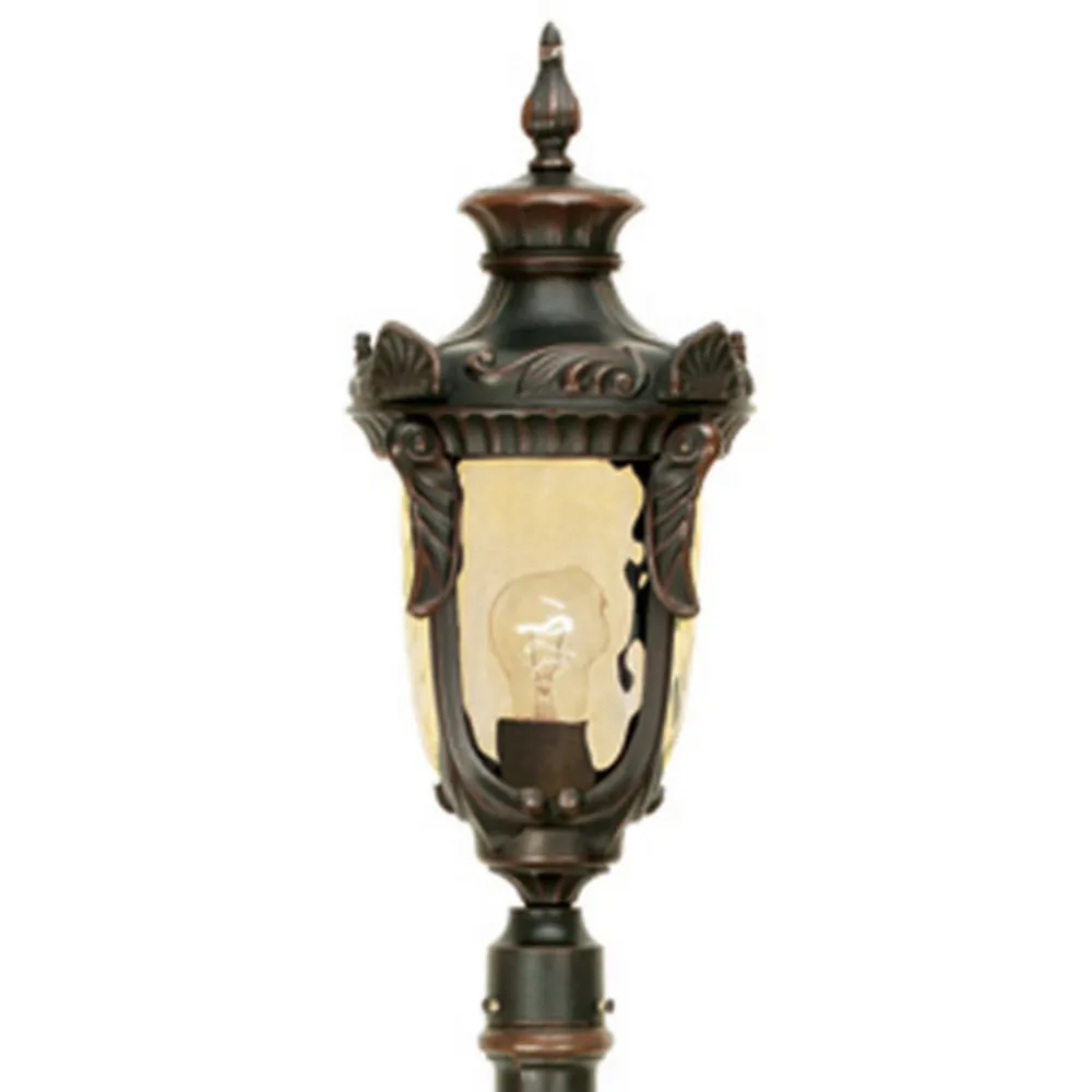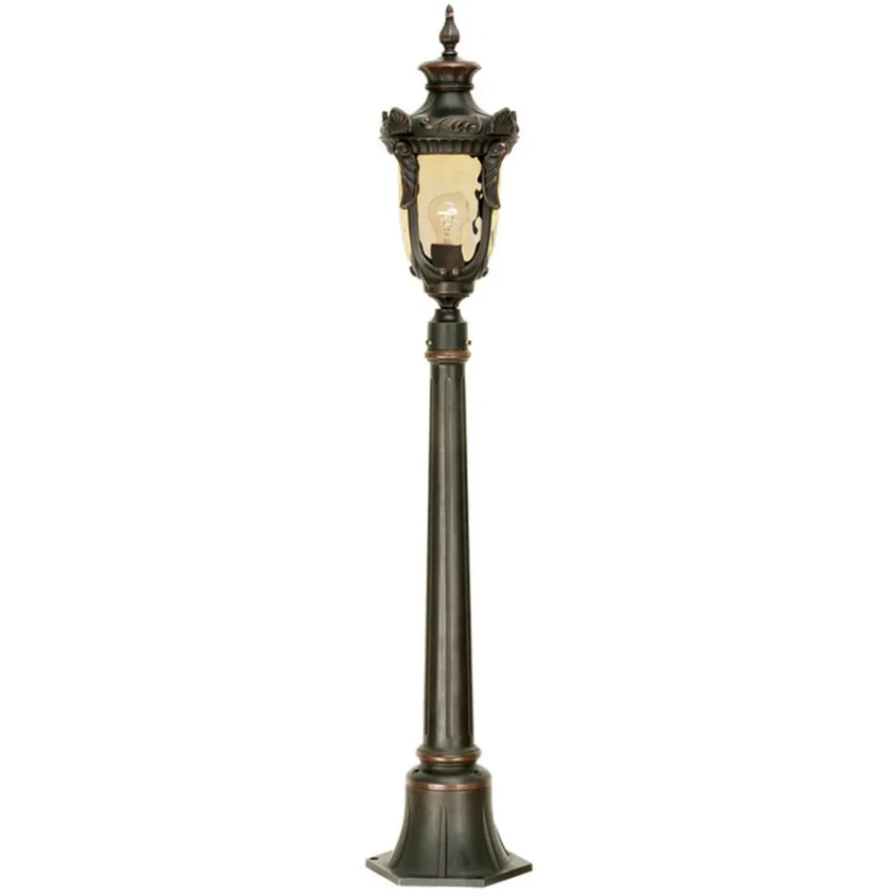 Både fargene – antikk bronse for holderen og fint ravgult for glasset – og formen samt ornamentene minner om gatelyktene i tiden rundt 1900. Med gangveilykten PHILADELPHIA kan man man hente dette preget inn i sin egen hage. Belegget av bronsepatina er påført for hånd.