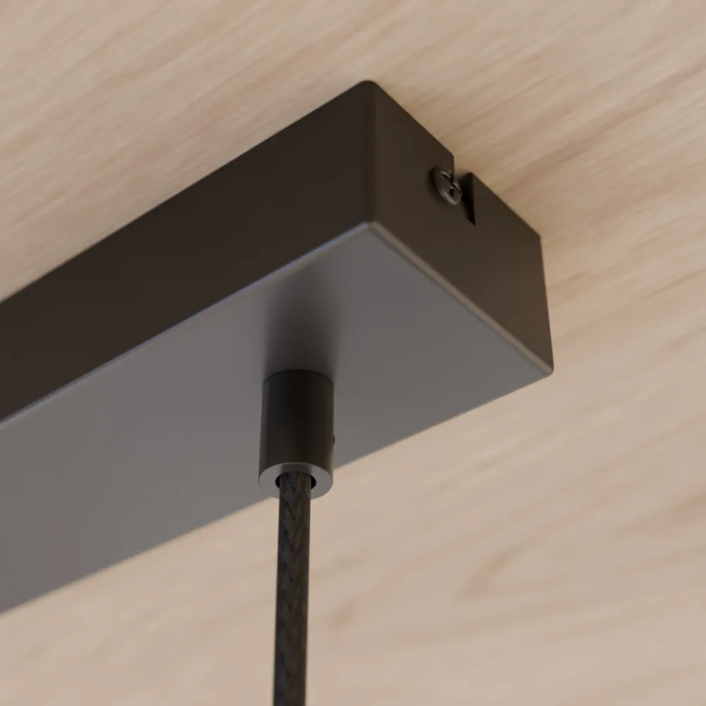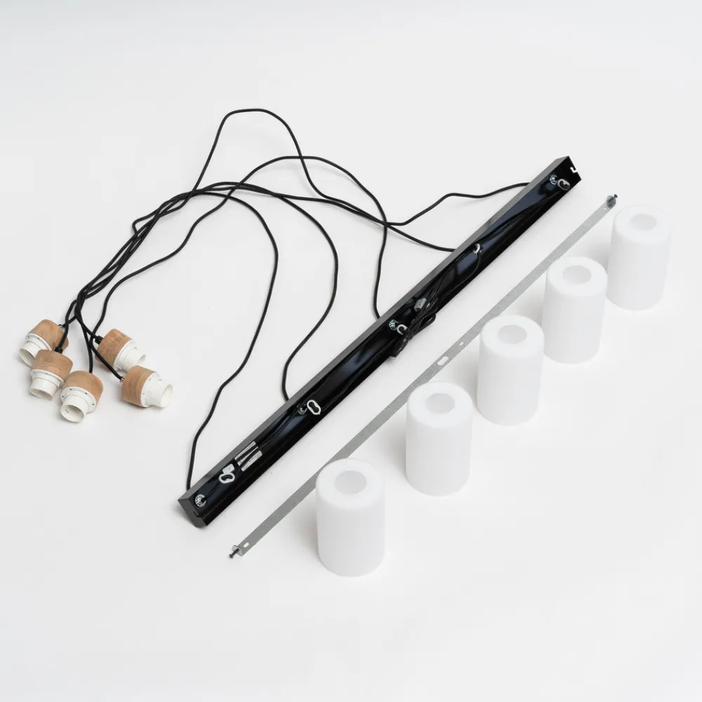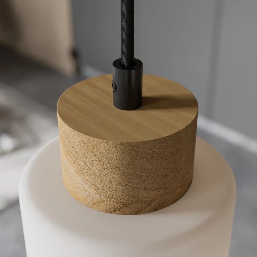 Talia pendellampe med fem lampeskjermer i hvitt glass og elementer i eiketre Talia-pendellampen har fem lampeskjermer med et vakkert element i eiketre. Disse er koblet til den svarte baldakinen via en tekstilkabel. De lyse fargene på lampeskjermene og den diskrete designen gjør at pendellampen enkelt kan integreres i ulike bomiljøer. Kombinasjonen av materialer og farger skaper dessuten en naturlig og koselig atmosfære i rommet. Lyskildene følger ikke med og kan derfor velges etter personlige preferanser. Det eneste du trenger å gjøre, er å velge riktig stikkontakt og wattstyrke. Det gjør det mulig å optimalisere lysforholdene slik at de passer til stedets krav og individuelle preferanser. De sylinderformede lampeskjermene avgir lys på bestemte steder og egner seg godt til å belyse bord eller disker. Envostar legger stor vekt på at armaturene skal være bærekraftige. Produktene produseres i Europa, noe som gir korte transportveier og minimerer CO2-utslippene. Treelementet som brukes, er laget av FSC-sertifisert eiketre og kommer fra miljøvennlige dyrkingsområder. Talia leveres i emballasje laget av gjenbrukbare materialer.