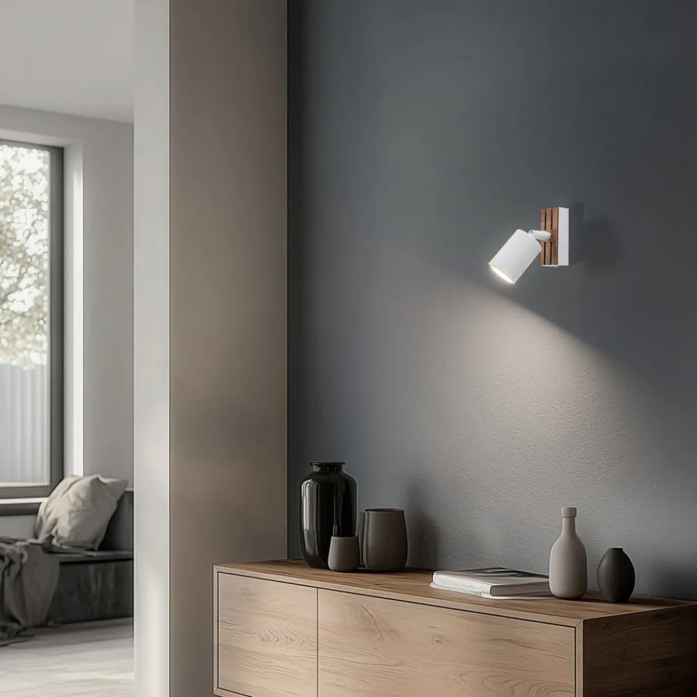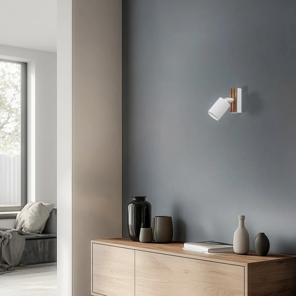 Envostar Tino veggspot kombinerer den naturlige skjønnheten i tre med den tidløse elegansen i hvitt stål. Denne harmoniske kombinasjonen av materialer gir hvert rom et spesielt preg og skaper en innbydende atmosfære. Veggspotten er ideell for bruk i stuer, ganger og soverom og tilbyr en fleksibel belysningsløsning som passer sømløst inn i forskjellige interiørstiler.