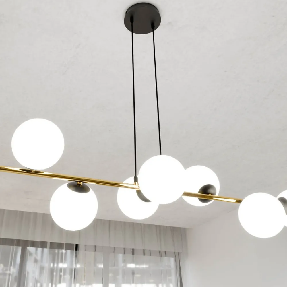 Hengelampen Glassy kombinerer moderne design med høy kvalitet i stål og glass. Denne lampen med 8 lyskilder imponerer med sin elegante fargekombinasjon i svart, gull og opalhvitt, som gir ethvert rom et spesielt preg. Enten i stuen, på kjøkkenet eller i spisestuen – hengelampen Glassy setter stilfulle aksenter og sørger for en behagelig lysatmosfære.