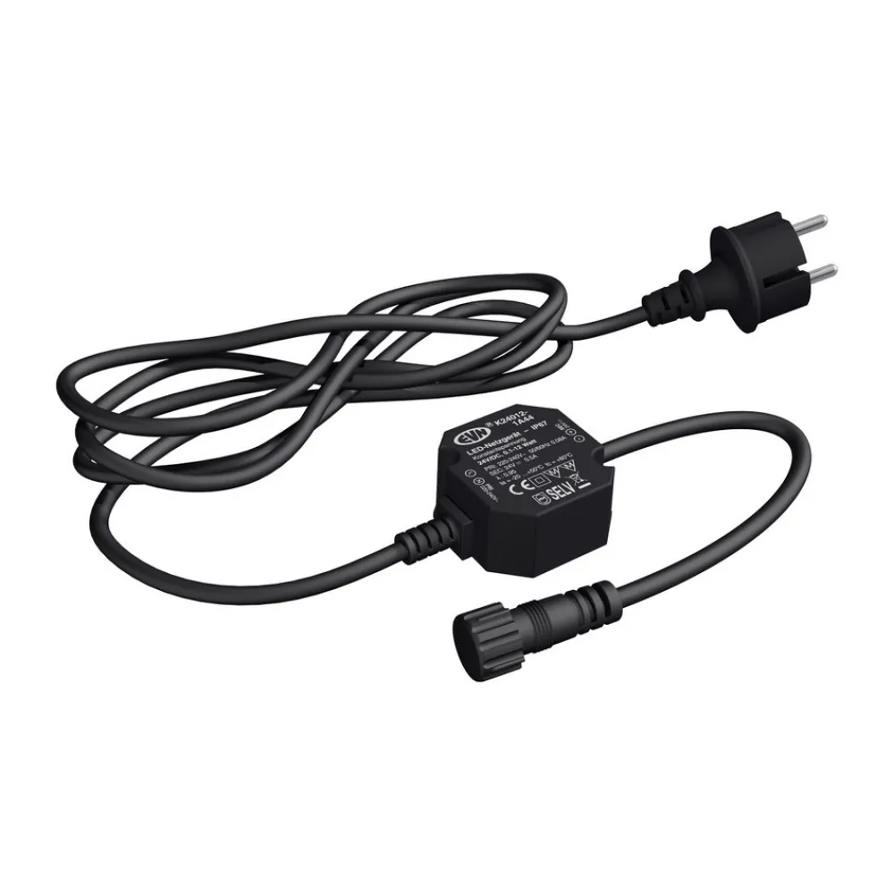 Den spenningskonstante LED-strømforsyningsenheten kan også brukes utendørs på grunn av beskyttelsesklassen IP44 og også i møbler innendørs. Strømforsyningsenheten er primært utstyrt med en 1,8 m lang gummikabel med konturert plugg og sekundært med en 20 cm lang gummikabel med stikkontakt for IP44-kontaktsystemet.