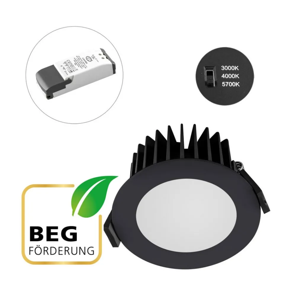 Fargetemperaturen kan stilles inn med en bryter på baksiden før montering. Her har du valget mellom varmhvit (3.000 K), kjølig hvit (4.000 K) og dagslys (5.700 K). I tillegg kan intensiteten til Solido85 dimmes utvendig ved å bruke forkant/bakkant.