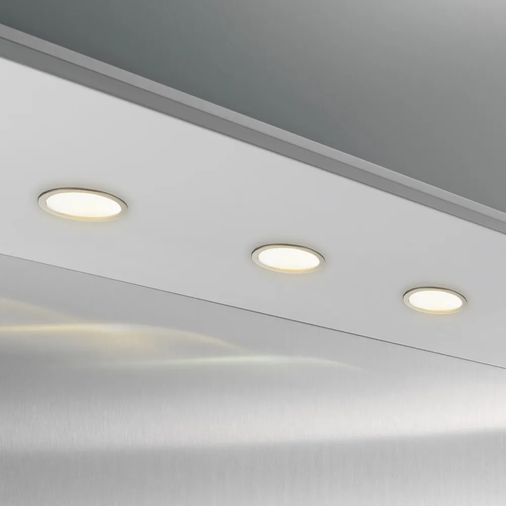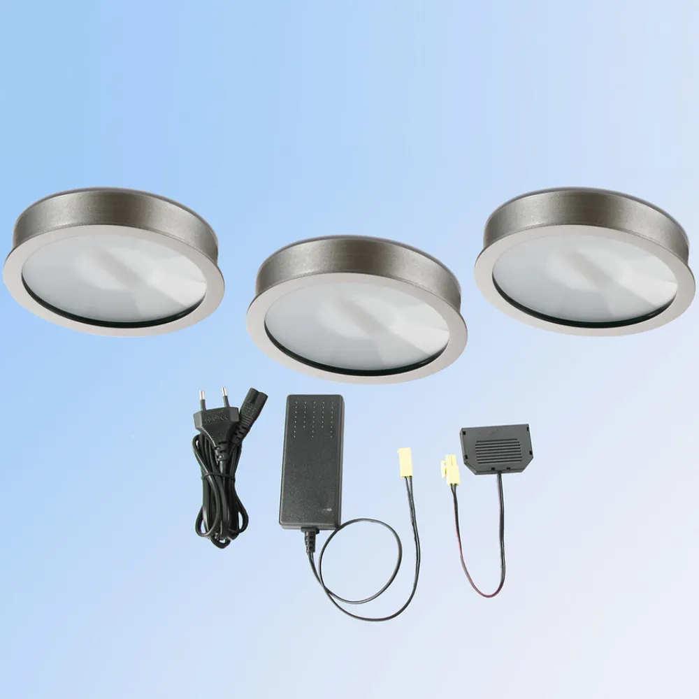 Tre allsidige og ytterst strømsparende LED-downlighter Cubic med smal, synlig metallramme i matt nikkelfinish. De medfølgende LED-ene avgir varmhvitt lys med en lysfarge på 2.700 kelvin. Nettadapteren er inkludert i leveransen.