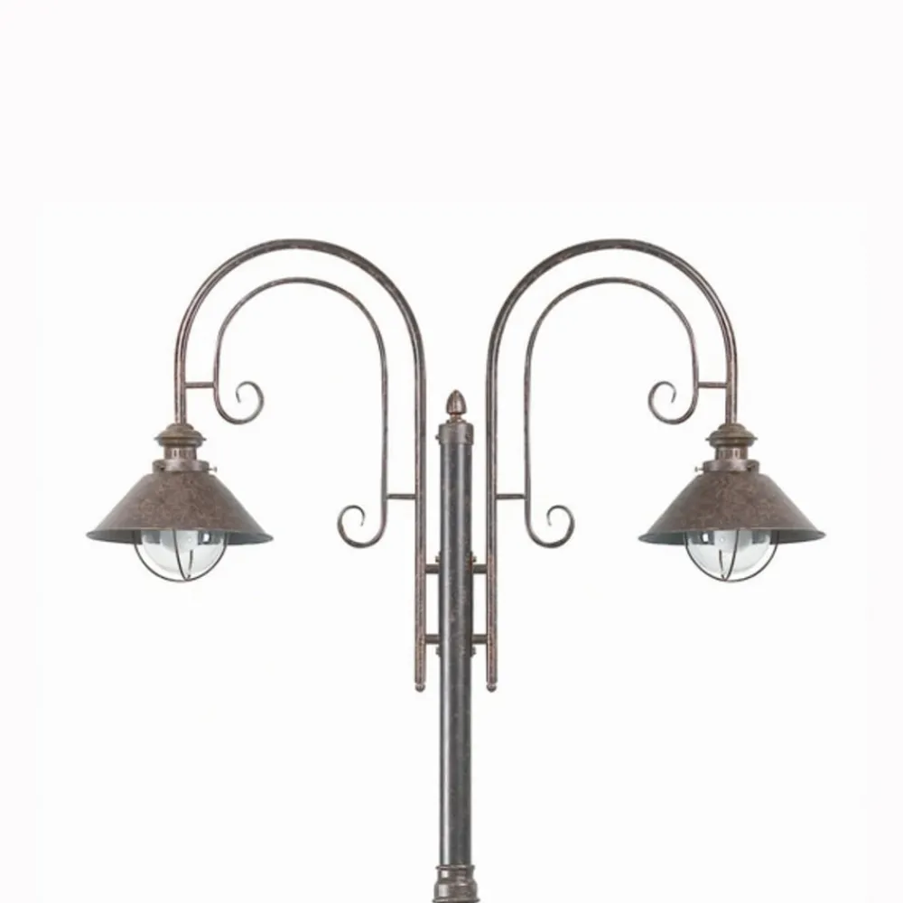 Denne lyktestolpen sørger for stil og eleganse i uteområdet. Bueformen med flotte dekorative elementer dominerer lyktestolpens design. Det store glasset med buede holdere kompletterer det staselige helhetsinntrykket. Lampen tilhører en lampeserie i sjarmerende stil som er produsert på en kunsthåndverksmessig måte. Den dekorative designen og det behagelige lyset sørger for en god atmosfære.