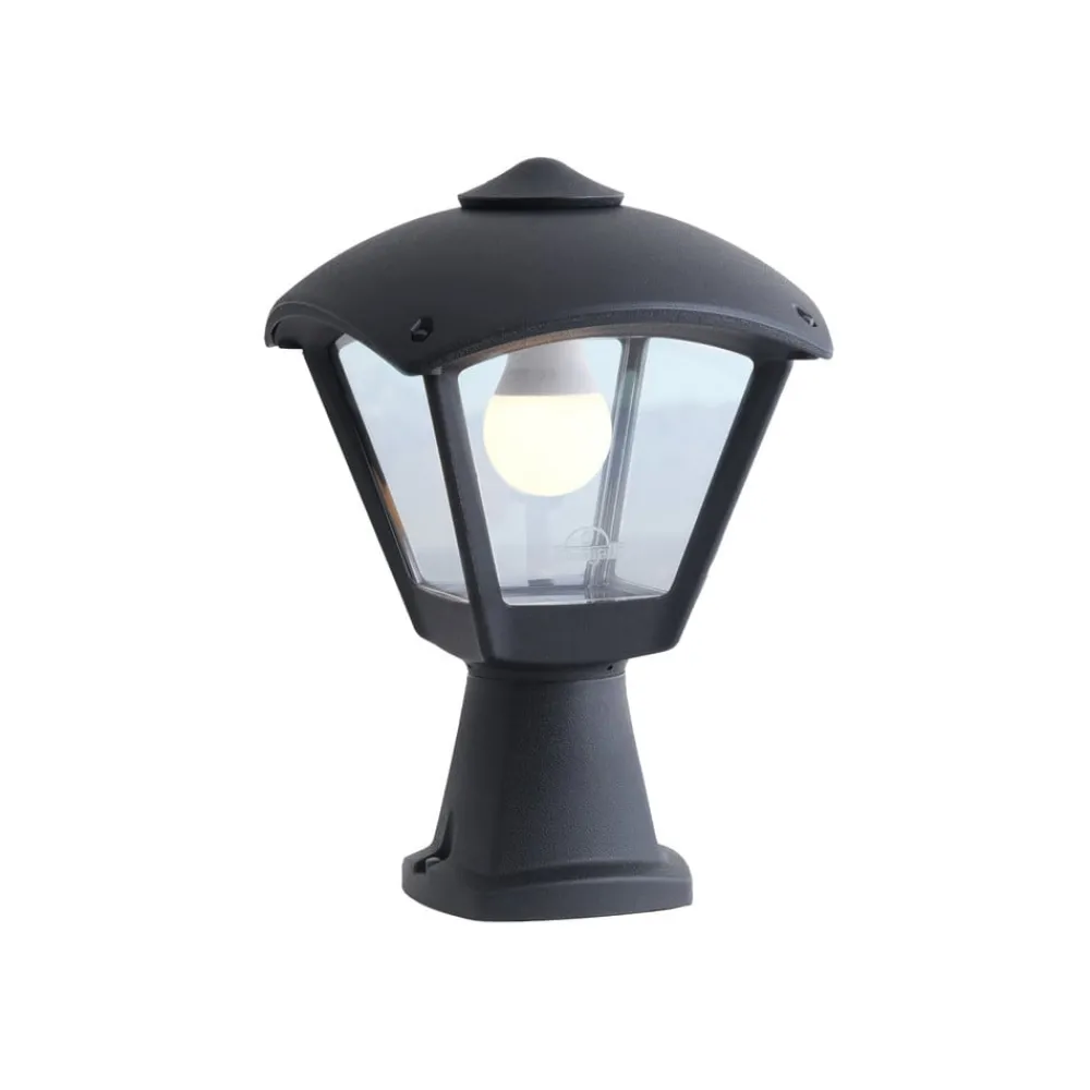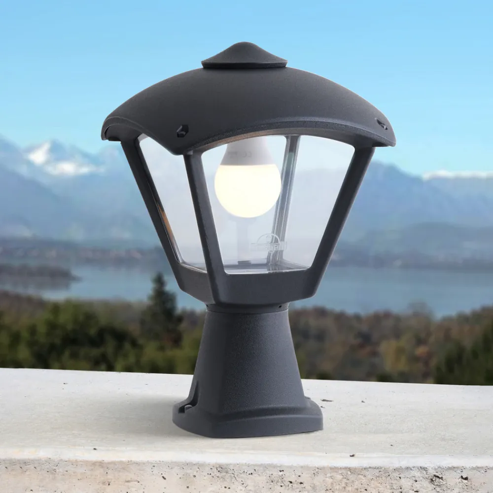 Dario lanterneformet sokkellampe med Mididisma-fot Denne svarte sokkellampen i kunstharpiks kjennetegnes av den lanterneformede lampeskjermen Dario, som er utstyrt med fire klare PMMA-deksler. I tillegg finnes den lille Mididisma-sokkelen. Avhengig av valg av E27-pære (eksklusiv) kan sokkelampen kompletteres på ønsket måte – dekorativt eller funksjonelt – Kapslingsgrad: IP55 – Egnet for bruk i nærheten av sjøen, UV-bestandig og rustfri