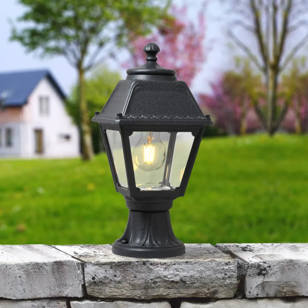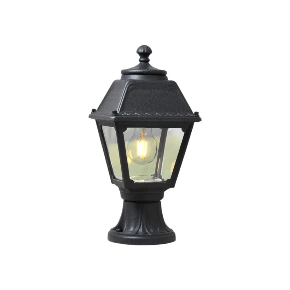 Mary-lyktformet lyktestolpe med liten Mikrolot-sokkel Denne svarte lyktestolpen i antikk stil er laget av robust kunstharpiks og utstyrt med den lyktformede Mary-lampeskjermen med fire klare PMMA-deksler. Mikrolot-sokkelen kompletterer designet perfekt – Inkluderer en varmhvit E27 LED-lyskilde – Beskyttelsesgrad: IP55 – Egnet for bruk i nærheten av sjøen, UV-bestandig og rustfri