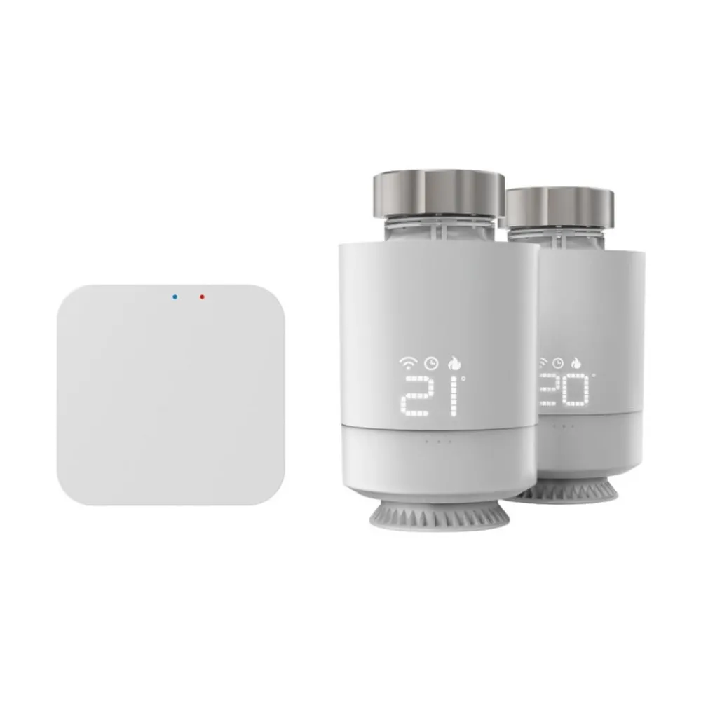 – Automatisk frostbeskyttelse – Ventilbeskyttelsesfunksjon mot forkalkning – Timer kan stilles inn via app – Gruppering av flere termostater mulig – Datalagring utelukkende på tyske servere Leveringsomfang: Kontrollsenter, strømforsyningsenhet med USB-kabel, 2 smarte radiatortermostater, 4 AA-batterier, 2 adaptersett (for Danfoss RA, RAV, Caleffi, Giacomini)