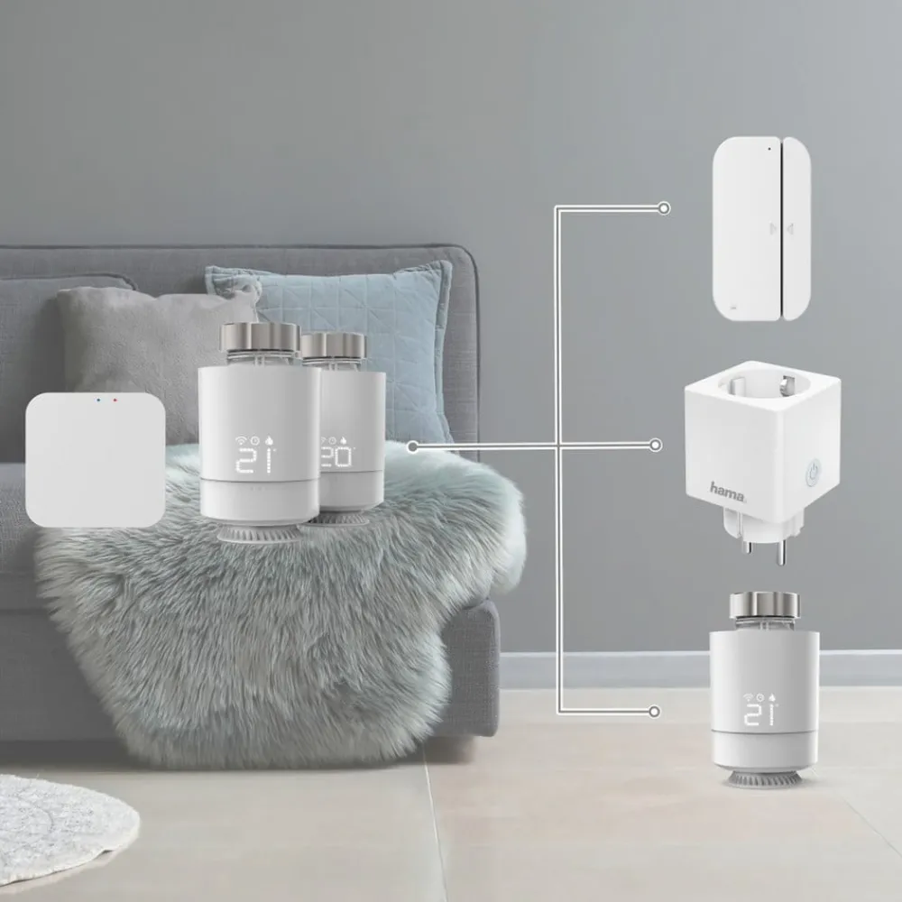 Komplett sett for smart varmestyring: radiatortermostat fra Hama i et sett med 2 stk. inkludert kontrollsenter, app og stemmestyring, kan utvides Alle nødvendige komponenter for smart styring av konvensjonelle radiatorer er inkludert i dette startsettet fra Hama. I tillegg til to termostater med adaptersett for alle vanlige radiatorer, følger det også med et kontrollsenter. Denne etablerer forbindelsen mellom de smarte termostatene og WLAN slik at varmen kan styres via app eller stemmekommando. I tillegg kan termostatene fortsatt betjenes manuelt som vanlig ved å vri på dem. LED-displayet på dreiebryteren er bare synlig under bruk. Via appen kan det stilles inn tidtakere, og ulike smarthuskomponenter eller termostater kan deles inn i grupper. Det er derfor spesielt praktisk at dette startsettet kan utvides med flere smarttermostater fra Hama (se tilbehør). Sammen med en smart dør-/vinduskontakt fra Hama (se tilbehør) kan det også stilles inn en automatisk funksjon som slår av varmen når døren eller vinduet åpnes, og slår den på igjen når det lukkes. Hvis radiatortermostatene kombineres med smartkontakter fra Hama, kan tilkoblede vifter eller klimaanlegg synkroniseres med oppvarmingen. Ulike smartkontakter er også tilgjengelige separat som tilbehør.