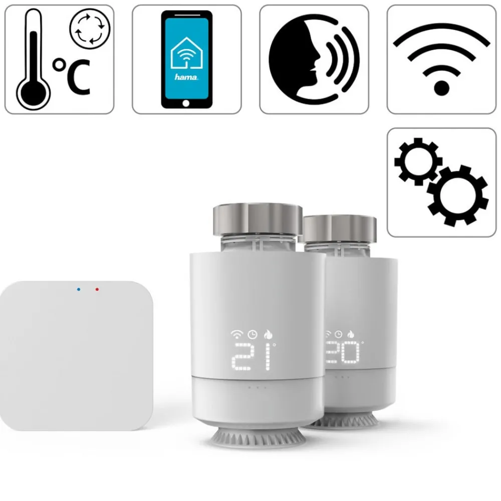 Tekniske egenskaper/kompatibilitet: – Senter for integrering og styring inkludert – Kan styres direkte via app og med stemmekommandoer – Gratis app for iOS og Android – Stemmestyring med Amazon Alexa, Google Assistant og Siri Snarveier mulig – Kan kombineres med et valgfritt antall termostater og andre smarthuskomponenter fra Hama (se tilbehør) Spesielle funksjoner: