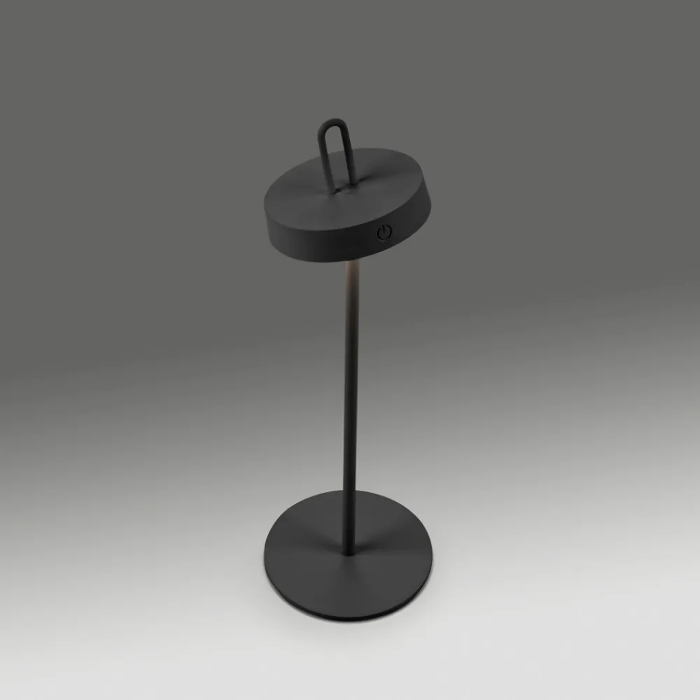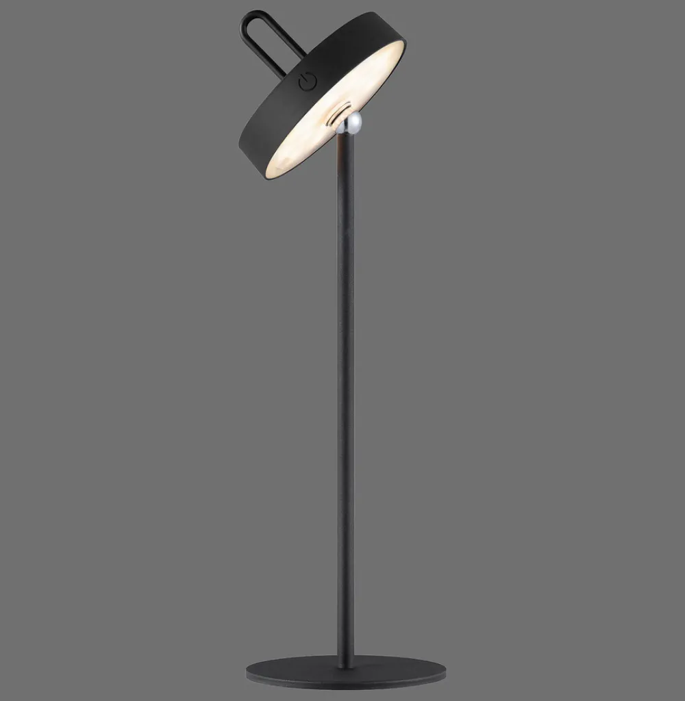Amag mobil LED-bordlampe med justerbart hode Amag LED-bordlampe i metall er en moderne og fleksibel ekstra lyskilde. Det runde hodet kan vippes rundt takket være et kuleledd. Den integrerte LED-spotlighten spotlighter nedover og kan slås på og dimmes ved hjelp av knappen på siden av hodet. Amag er utstyrt med et oppladbart batteri, kan brukes uten strømtilkobling og er også det ideelle HighLight-lyset for hagen og terrassen takket være sprutbeskyttelsen – Kapslingsgrad: IP44 – Ladetid: 4 timer – Brenntid ved høy lysstyrke: 7 timer