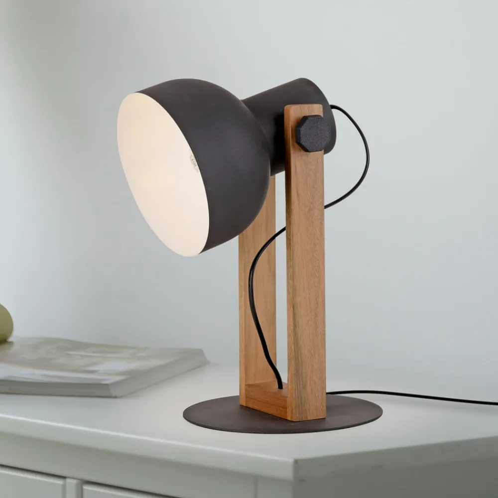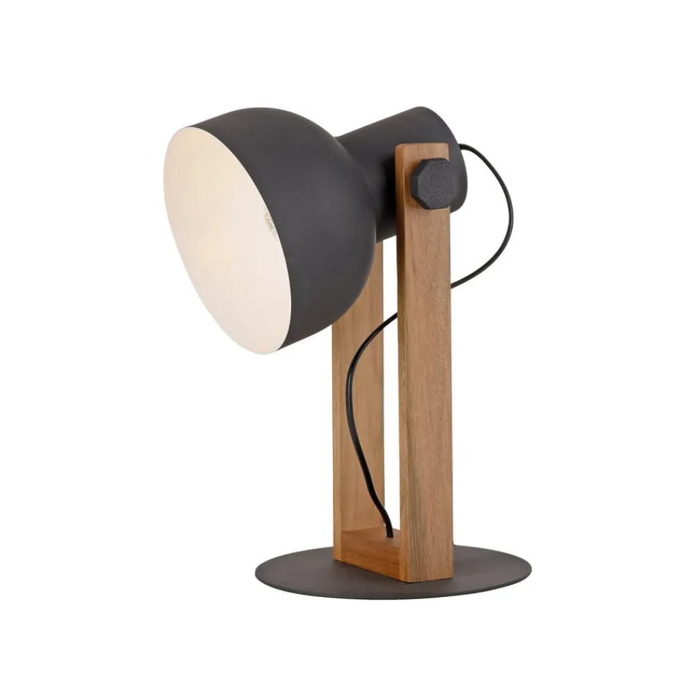 Cup 2.0 bordlampe: svingbar skjerm Den tynne bunnplaten på Cup bordlampe og spotlighten, som kan svinges for å tilpasse lysretningen, er laget av svartlakkert metall. Rammen er laget av akasietre, noe som gir lampen et naturlig uttrykk. Innsiden av spotlighten er hvit, slik at lyset reflekteres optimalt