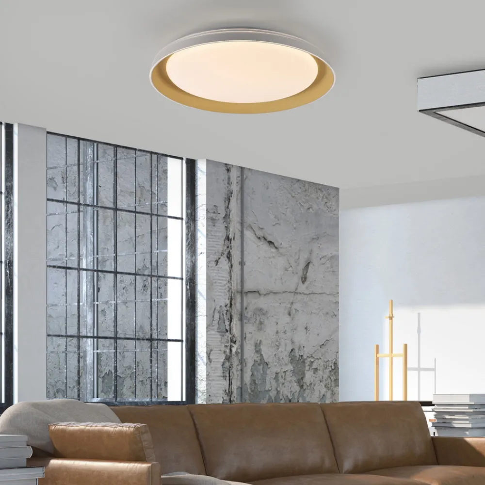 Sati taklampe, dimbar via lysbryter Den runde taklampen Sati er utstyrt med en satinert diffuser nederst og en transparent ring øverst i den flate skjermen, noe som gir en jevn rombelysning og et lite indirekte lys som skaper en ring av lys i taket. En spesiell egenskap ved armaturen er at den kan dimmes ved hjelp av lysbryteren. Lyset kan stilles inn på tre ulike lysstyrkenivåer ved gjentatte omkoblinger og dermed tilpasses ethvert belysningsbehov. Minnefunksjonen lagrer det sist valgte lysstyrkenivået til neste gang lyset slås på.